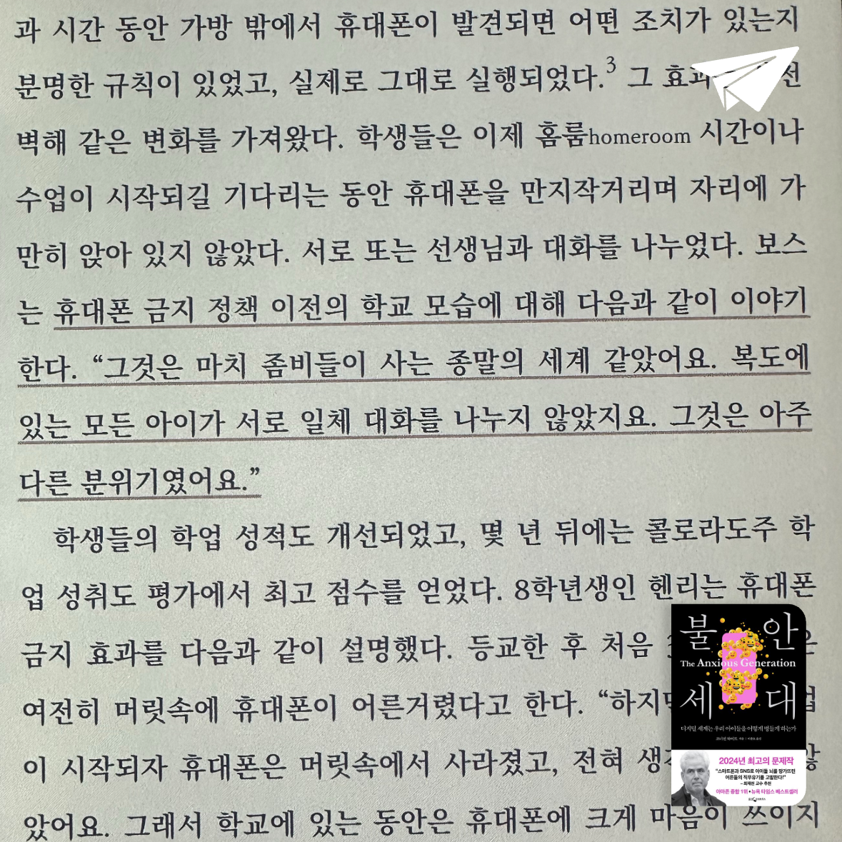 요약이 책은 사회심리학자 조너선 하이트가 디지털 시대에 자라는 아이들의 정신 건강 위기를 분석한 작품이다. 저자는 1990년대 중반 이후 태어난 ‘Z세대’가 불안, 우울, 자살률 증가 등 심각한 정신적 문제를 겪고 있으며, 이를 스마트폰과 소셜 미디어의 급격한 확산과 연결 지어 설명한다. 그는 이러한 현상을 ‘대불안 시대’로 명명하며, 디지털 환경이 아이들의 뇌와 사회적 관계에 어떻게 영향을 미치는지 과학적 데이터와 사례를 통해 탐구한다. 📱
