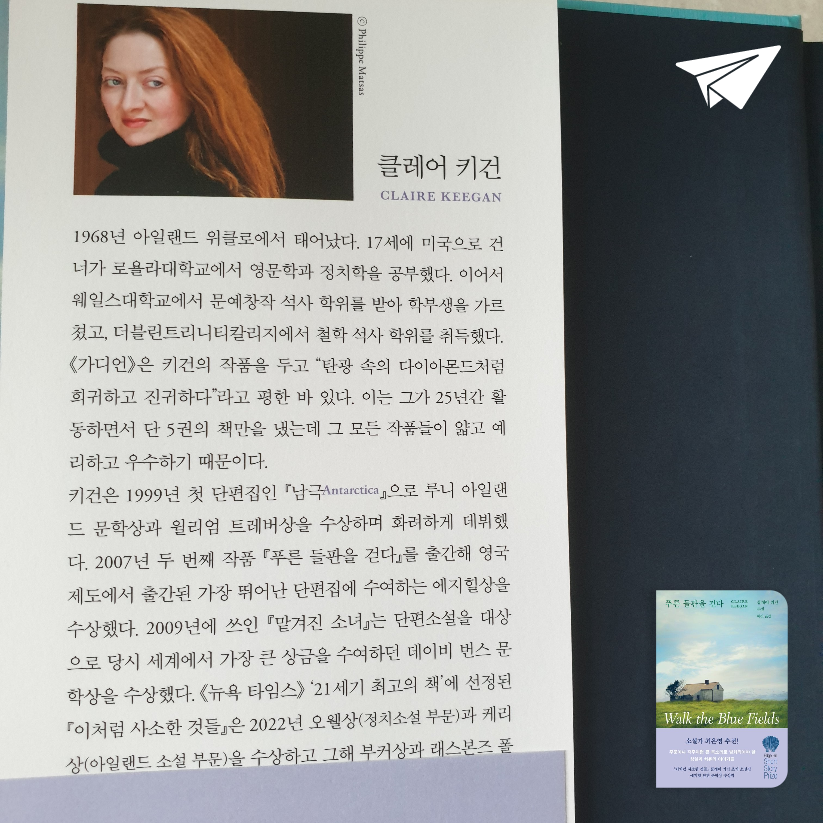 초역작 『맡겨진 소녀』와 대표작 『이처럼 사소한 것들』로 독서가들의 열렬한 사랑을 받은 아일랜드 소설가 클레어 키건의 신간이 다산책방에서 출간되었다. 『푸른 들판을 걷다』는 국내에 세 번째로 소개하는 작가의 작품이자, 처음으로 선보이는 소설집이다.