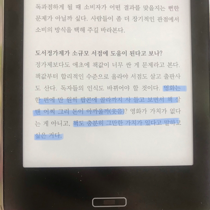 한국에서 책이 만들어지고 유통되는 과정에 문제가 많다는 것도 알게 되었다. 나만 해도 처음 도서정가제가 시행될 때 엄청나게 싫어했다. 어릴 땐 5천원이면 책 한 권 사서 읽을 수 있게 되었는데, 책들이 불필요하게 무거워지고 비싸지는 바람에 책에서 멀어지는 듯한 기분이 들었기 때문이다. 왜 그런 정책이 실시되었는지는 생각도 못 했다. 교보문고나 영풍문고, 반디앤루니스, 예스24, 알라딘 등과 같은 대형 서점이 도서판매에 큰 파이를 먹게 되면서 그들은 출판사로부터 좋은 매입가로 다량 구매하여 싸게 판매할 수 있지만, 동네 서점이나 독립 서점들은 대량 판매도 못 하는데 매입가까지 비싸서 할인하지 않아도 남는 게 없는 실상이라 생긴 정책이었다. 그럼에도 불구하고 큰 매입률 차이와 최대 할인율 10% + 적립 5%로 인해 작은 서점들은 문을 닫아간다. 심지어 이 책이 출간된 지 아직 1년 정도밖에 지나지 않았는데 일곱 개 독립서점 중 세 곳이 문을 닫았다. 세상에. 사실 나도 인스타그램이나 블로그, 독립 온라인 서점에서 보고 흥미를 느낀 책을 예스24에서 구매한 경험이 있다. 출국을 준비하며 최대한 편하게 오래 서적을 내 곁에 보관하고자 이북으로 책을 구매하려던 이유도 있지만, 나쁘다. 생각해보니 정말 나 나쁘다. 큐레이팅이 얼마나 어려운 것인지 화장품 브랜드 큐레이팅을 해봐서 알면서도 책 큐레이팅에 대한 존중이 전혀 없었다. 내가 어떠한 책에 흥미를 느끼게 되었다면 내 감정을 유도한 큐레이터의 노력의 결실인 것을, 대형 서점에게 돈을 쥐여주고야 말았다.