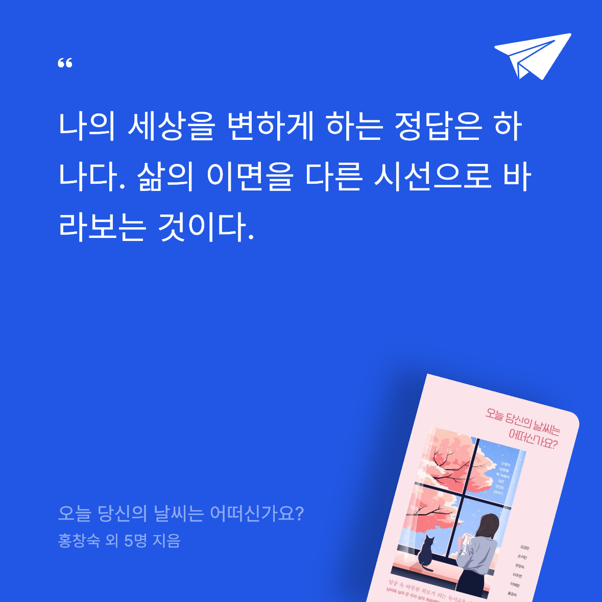 본격적으로 하루를 시작하기 전, 가장 먼저 찾아보게 되는 것이 있다. 그것은 바로 ‘일기예보’이다. ‘오늘의 날씨는 일기예보가 알려주는데, 인생의 날씨는 어디서 어떻게 확인할 수 있을까?’라는 의문을 가진 여섯 명이 만났다. 그들은 독서교육 전문가답게 인생 날씨를 책과 함께 살펴보며 하나둘 글을 쓰기 시작했다. 그리고 그 기록은 마침내 『오늘 당신의 날씨는 어떠신가요?』라는 이름의 책으로 완성되었다.