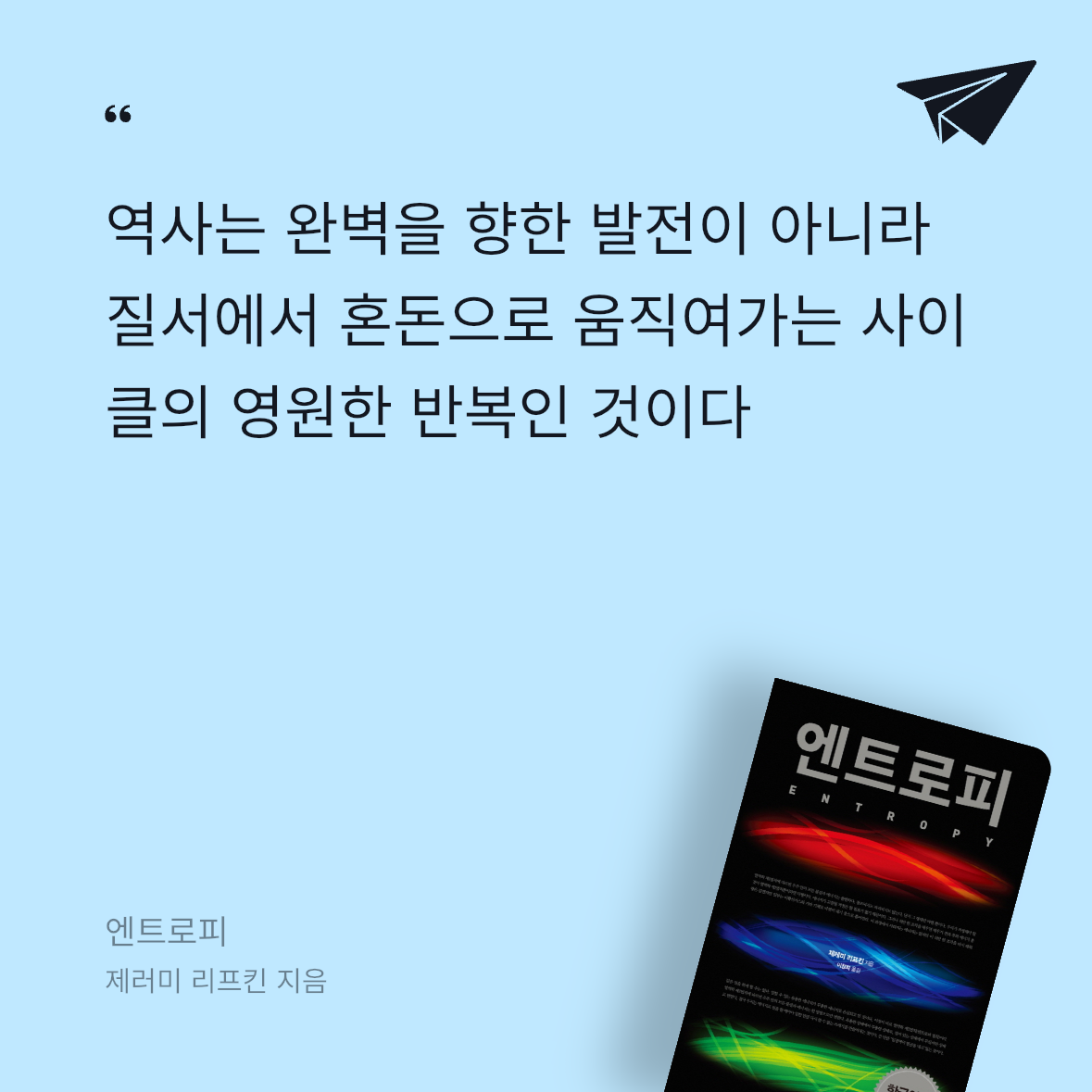 ‘물질이 열역학적 변화를 일으킬 때 변화된 온도를 열량으로 나눈 값으로서, 쓸 수 없게 된 에너지’를 뜻하는 엔트로피는 가용 에너지를 초과하는 상황에 대한 경고를 담고 있는 책이다. 이를 통해서 역사를 진보로 보는 시각을 무너뜨린다.