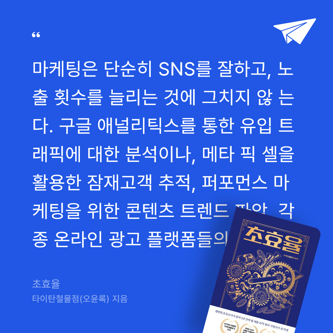 요약『초효율』은 타이탄철물점(오윤록)이 2024년 8월 타이탄북스에서 출간한 자기계발서로, ISBN 9791199015807을 통해 기록되었다. 📖 약 276페이지로 구성된 이 작품은 YES24 리뷰 총점 9.8(150건)을 기록하며, “시간과 에너지를 극대화하는 실용적 생산성 가이드”로 평가받는다(). 타이탄철물점은 유튜브 채널 ‘타이탄철물점’(구독자 100만 명 이상)에서 생산성, 자기관리 콘텐츠로 MZ세대에게 큰 인기를 얻은 오윤록의 필명이다. 그는 공기업 엔지니어로 10년 근무하며 체득한 효율적 시간