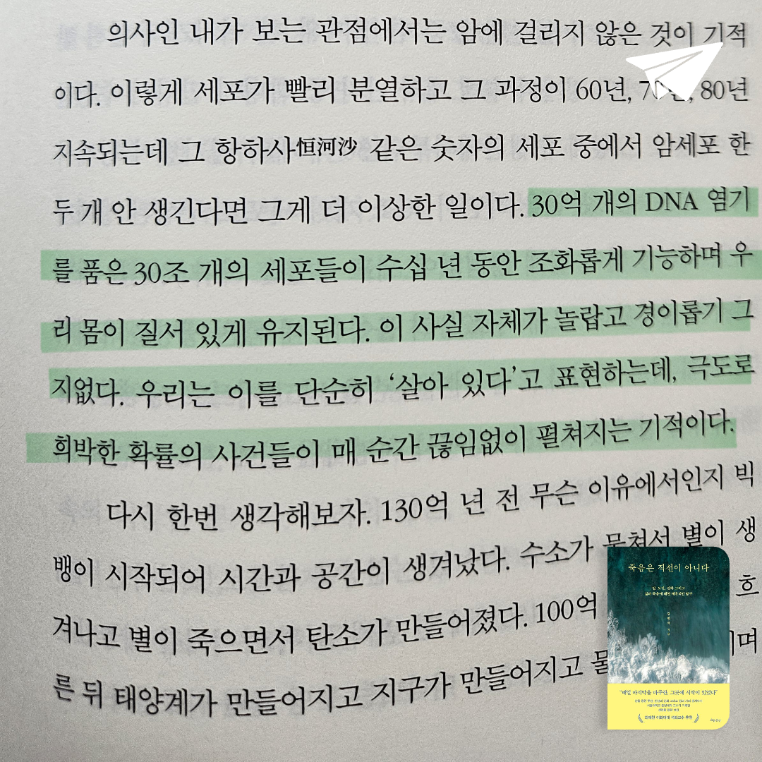 요약‘죽음은 직선이 아니다’는 서울대 암병원 종양내과 전문의 김범석 교수가 2024년 흐름출판에서 펴낸 에세이로, 20여 년간 암 환자들을 치료하며 생과 사의 경계를 탐구한 기록이다. 📖 320쪽 분량의 이 책은 저자의 전작 ‘어떤 죽음이 삶에게 말했다’(2021)의 연장선에서, 암의 과학적 이해와 환자들의 삶, 그리고 죽음에 대한 철학적 성찰을 깊이 있게 다룬다. 저자는 “죽음은 직선이 아니라 임계점을 넘어 급격히 변하는 순간”이라