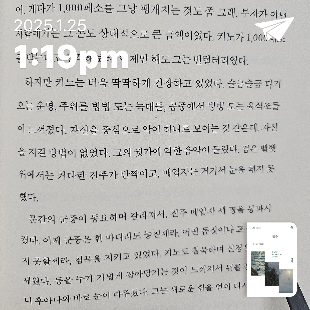 『진주』는 존 스타인벡이 1947년에 출간한 소설로, 2025년 1월 문예출판사에서 김승욱의 번역으로 새롭게 출간되었다(ISBN 9788931024159). 📖 약 160페이지로 구성된 이 작품은 YES24 리뷰 총점 10.0(10건)을 기록하며, “멕시코 민담을 바탕으로 인간의 욕망과 자연의 순리를 우화적으로 그린 스타인벡의 걸작”으로 평가받는다(). 1902년 캘리포니아 살리나스에서 태어난 스타인벡은 『분노의 포도』(1939)로 퓰리처상을, 1962년 노벨문학상을 수상한 미국 사실주의 문학의 거장이다.