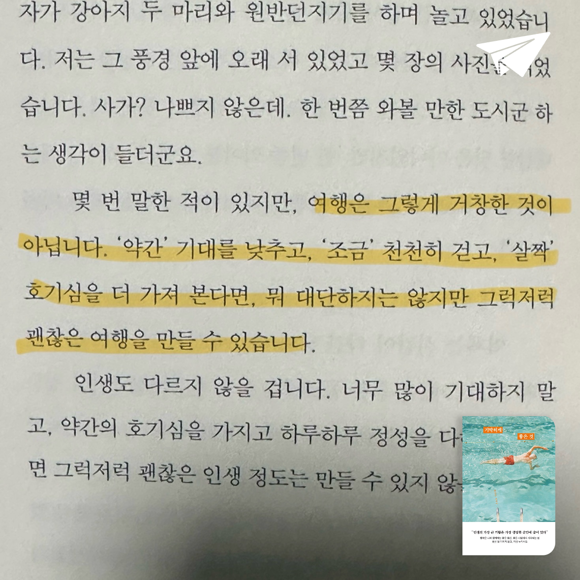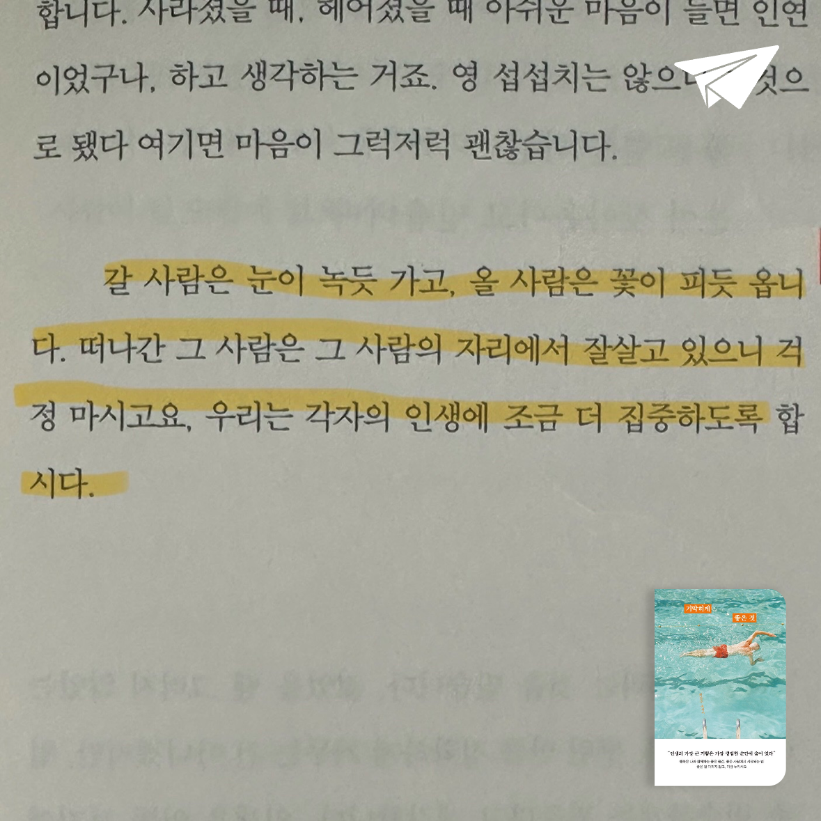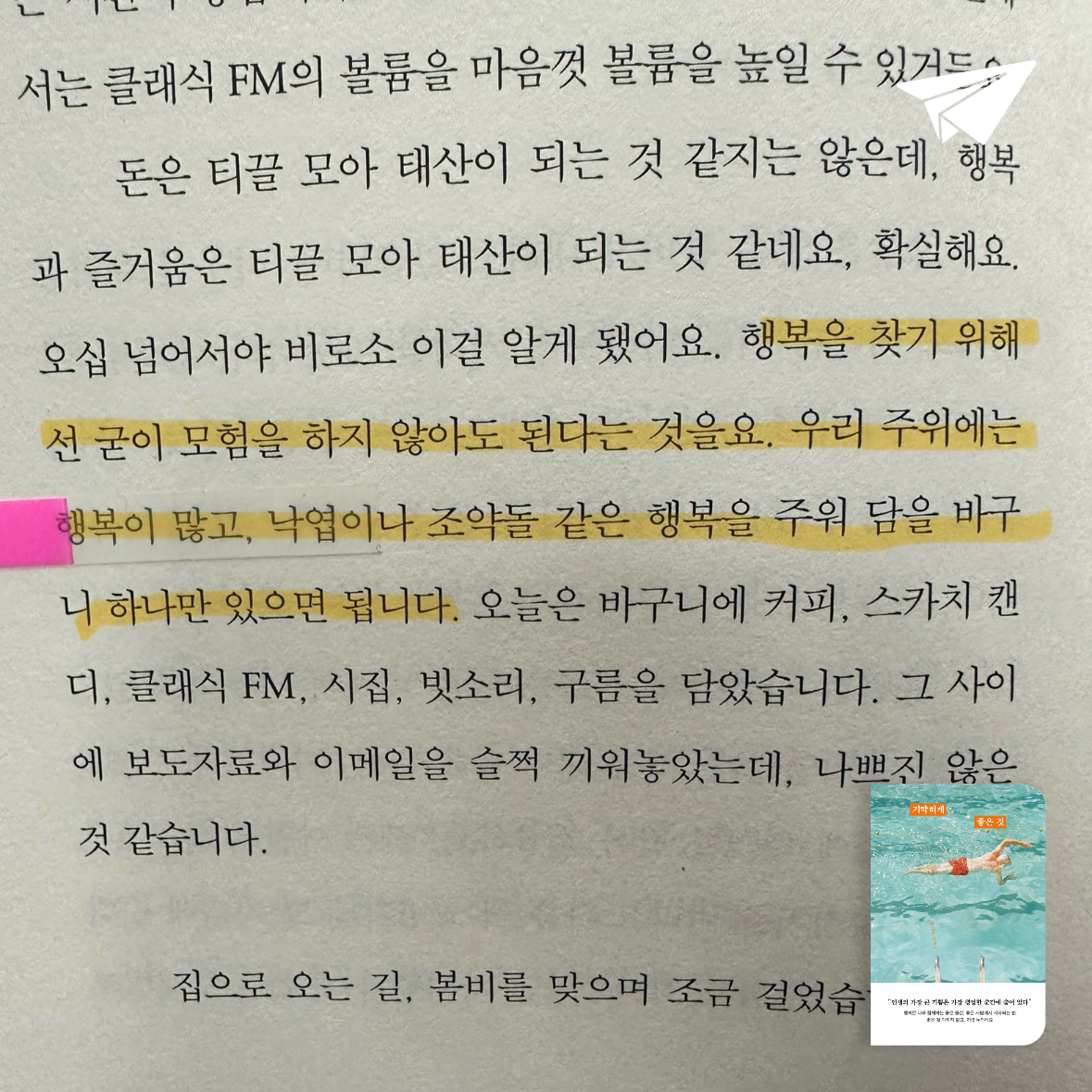 행복이 먼 곳의 대단한 것이 아닌, 우리가 매일 마주하는 작은 사물들, 따뜻한 한 끼 식사, 그리고 소소한 순간들 속에 숨어 있다고 말하는 책이다. 작가는 아침의 따스한 햇살, 커피 한 모금에서 느끼는 향기, 화초에 분무기로 물을 주다 마주친 무지개처럼 소소한 순간들이 우리의 삶을 빛나게 한다고 이야기한다.