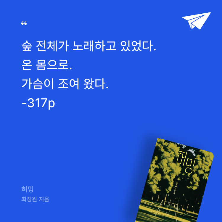 『폭풍이 쫓아오는 밤』으로 창비×카카오페이지 영어덜트소설상을 수상하고 『저희는 이 행성을 떠납니다』로 비룡소 틴스토리킹상을 수상하며 평단과 독자의 너른 사랑을 받은 최정원의 신작 장편소설 『허밍』(소설Y)이 출간되었다.