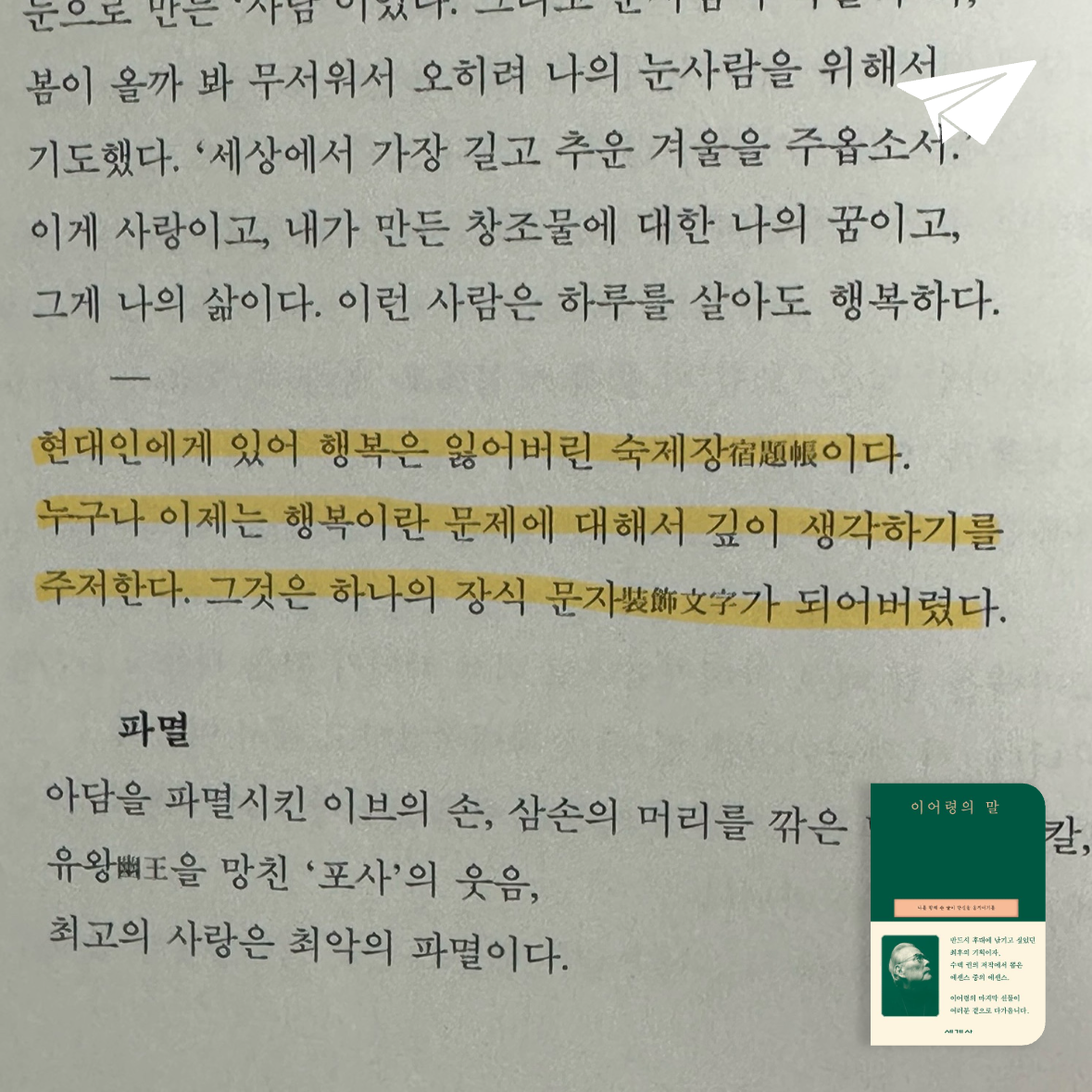 요약이어령의 *이어령의 말 (나를 향해 쓴 글이 당신을 움직이기를)*은 2022년 세계사에서 출간된 에세이로, ISBN 9788933803653을 통해 독자들에게 공개되었다. 📖 이 책은 한국 문학계의 거장 이어령이 2022년 2월 26일 88세로 서거하기 직전까지 남긴 마지막 글들을 엮은 유고작이다. 평생 130여 권의 저서를 통해 지성과 감성을 아우른 저자는, 말년에는 암 투병 중에도 창작과 사유를 멈추지 않았다. 이 책은 그의 생애와 사상이 압축된 1,00