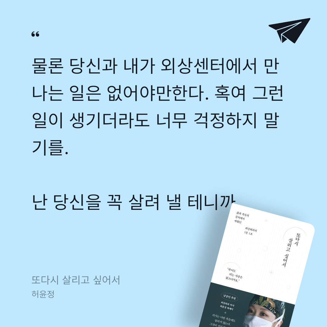 요약『또다시 살리고 싶어서 (삶과 죽음의 문턱에서 싸웠던 외상외과의 1분 1초)』는 외상외과 전문의 허윤정 교수가 자신의 의료 현장 경험과 생사의 갈림길에서 환자를 살리기 위해 분투한 순간들을 기록한 에세이다. 🩺 저자는 서울아산병원 외상외과에서 10여 년간 근무하며, 교통사고, 추락, 자해 등으로 생명이 위태로운 환자들을 마주했다. 이 책은 외상외과 의사의 긴박한 일상과 그 속에서 느끼는 책임감, 좌절, 그리고 희망을 생생히 담아내며, 생