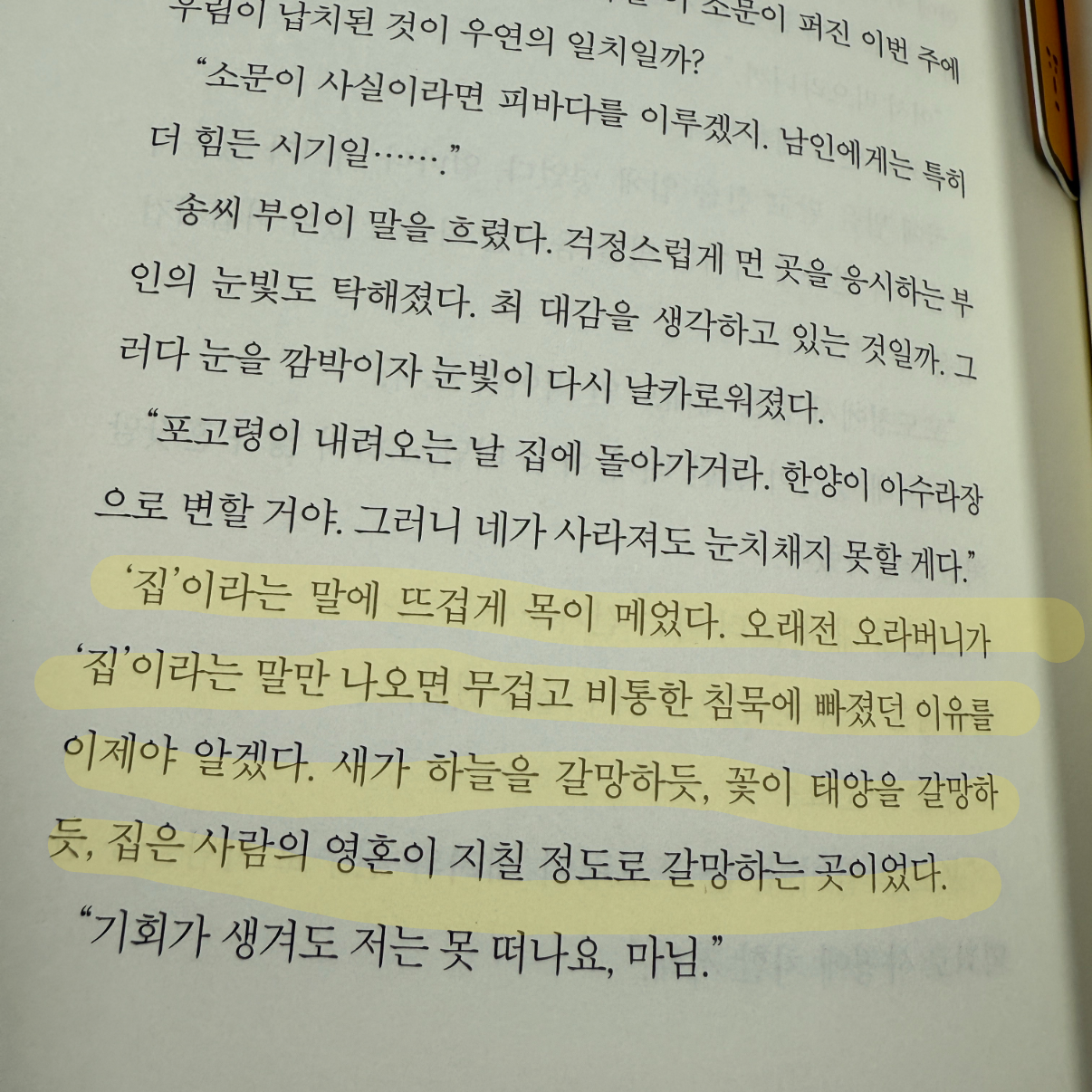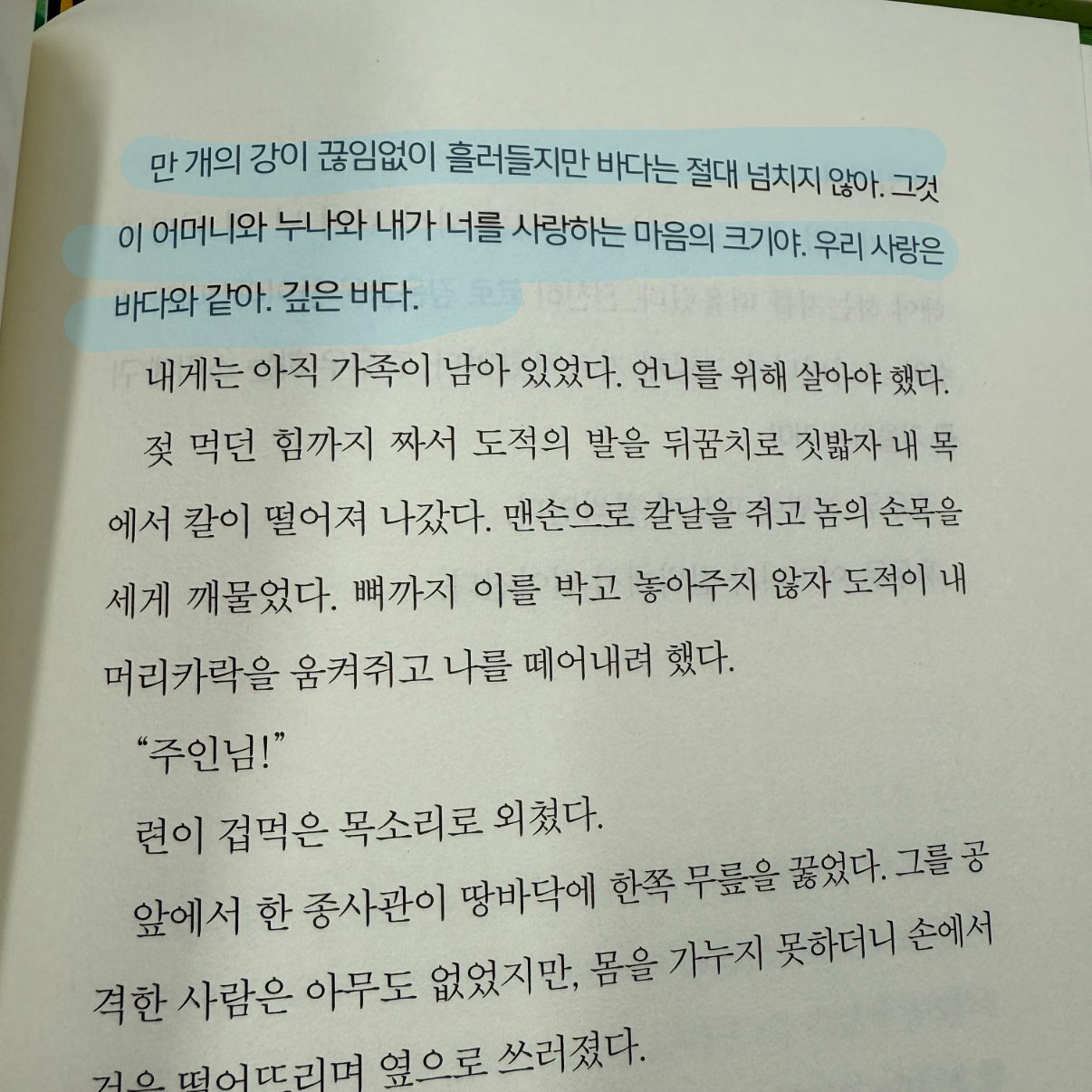 "태양이든 땅이든 달이든, 너는 유능한 아이다. 내게는 그래. 너는 복잡하게 꼬인 이 사건의 실타래를 이해할 수 있는 머리를 가지고 있지. 그런 사람은 많지 않다. 다모 설. 남자든 여자든." 아직 말 위에 앉아 있었지만 고삐를 쥔 손가락의 힘이 풀렸다. 오라버니가 떠난 후로 나를 제대로 봐준 사람은 처음이 라는 느낌이 들었다. (p.182)