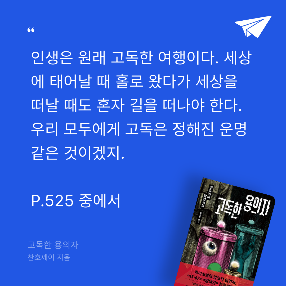 요약『고독한 용의자』는 홍콩 추리소설가 찬호께이의 2025년 신작으로, 위즈덤하우스에서 출간된 정통 범죄추리소설이다. 🕵️♂️ 《13·67》과 《망내인》으로 중화권 추리소설의 거장으로 자리 잡은 찬호께이가 3년 만에 선보인 이 작품은 포스트코로나 시대 홍콩 사회를 배경으로 인간의 고독과 범죄의 어두운 이면을 섬세하게 그린다. 리얼리즘을 표방하며 사회적 현상을 반영한 이 소설은, 20년간 세상과 단절된 남자의 죽음과 옷장 속 시체들로 시작되는 미궁 같은 이야기를 풀어낸다. 📖[](https://