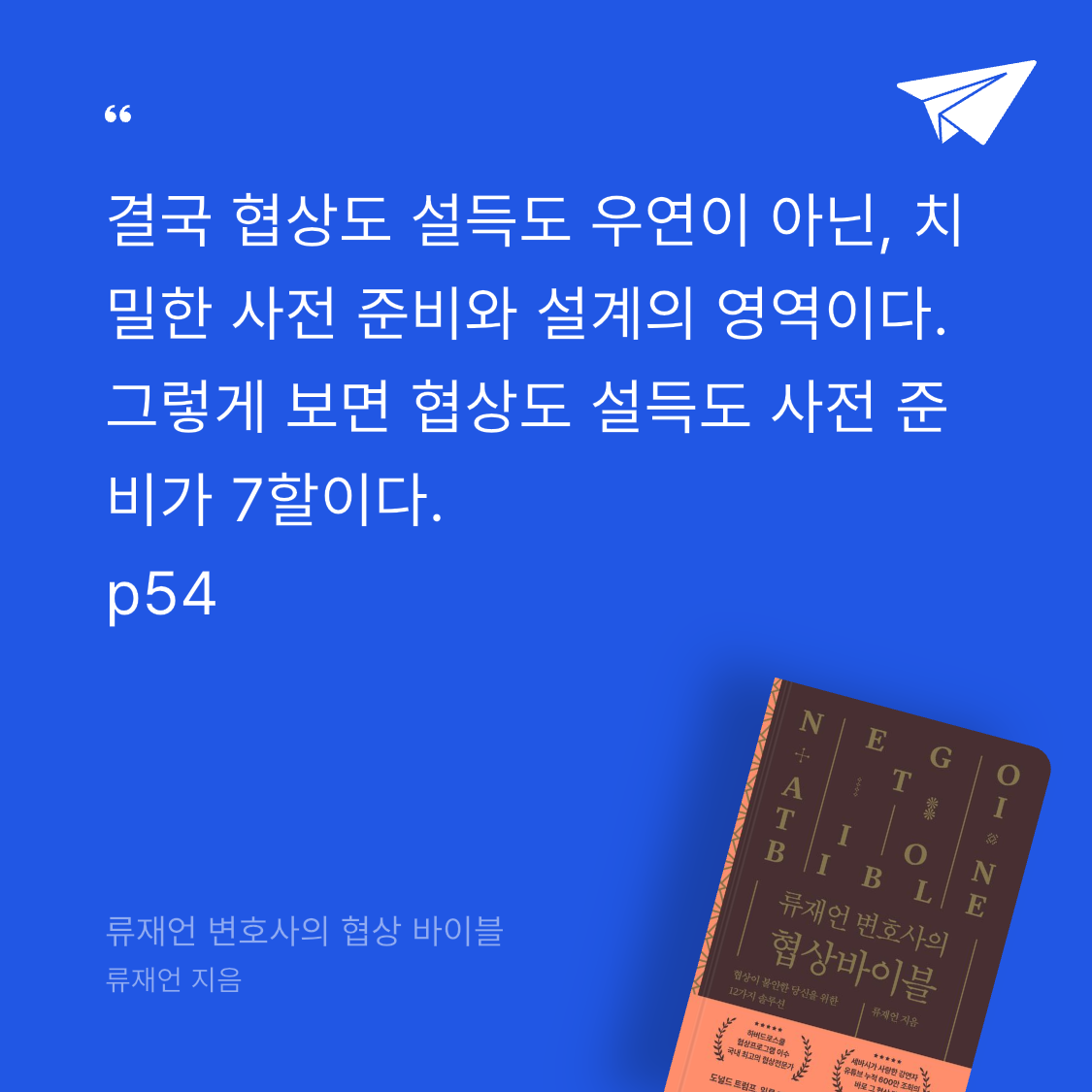 요약『류재언 변호사의 협상 바이블 (협상이 불안한 당신을 위한 12가지 솔루션)』(ISBN 9791198112217)은 협상 전문가 류재언 변호사의 자기계발서로, 2023년 5월 31일 라이프레코드에서 출간되었다. 📖 약 384페이지로 구성된 이 책은 하버드 로스쿨 협상프로그램(PON)을 수료한 저자가 20년간 기업분쟁 및 계약협상 경험을 바탕으로, 협상의 본질과 실용적 기술을 12가지 원칙으로 체계화한 가이드다. 류재언은 법무법인 율본의