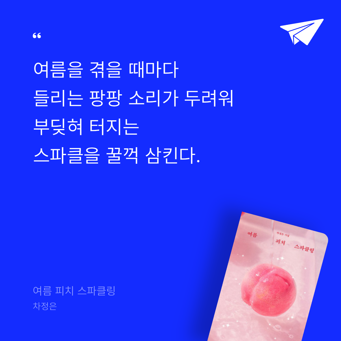 요약《여름 피치 스파클링》은 19세의 젊은 시인 차정은의 두 번째 시집으로, 그녀의 첫 시집 《토마토 컵라면》에 이어 청춘의 감성과 여름의 생동감을 담아낸 작품이다. 이 시집은 뜨거운 여름의 순간들을 과즙이 터지듯 생생하고 청량한 언어로 표현하며, 젊음의 설렘, 사랑, 불안, 그리고 희망을 노래한다. 차정은의 시는 일상에서 건져 올린 소소한 순간들을 독특한 이미지와 감각적인 비유로 풀어내며, 10대와 20대의 공감을 불러일으킨다. 책 제목처럼 ‘피치 스파클링’은 달콤하면서도 톡 쏘는 여름의 맛을