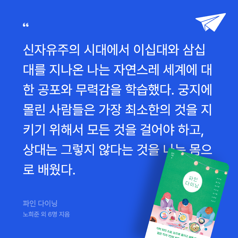 '음식'과 '요리'라는 소재로 의기투합한 젊은 작가들의 테마소설집. 소설가 최은영, 황시운, 윤이형, 이은선, 김이환, 노희준, 서유미는 일상의 장면들 곳곳에 자리 잡고 있는 음식들과 그 이면에 숨어 있던 이야기들을 <파인 다이닝>이라는 식탁 위에 차례차례 선보인다.