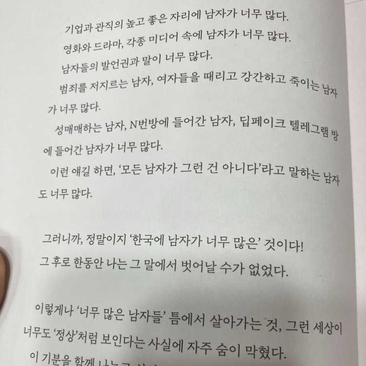 한국의 여성이라면 누구나 한 번쯤 “아, 한국에 남자가 너무 많다”는 말을 한숨처럼 내뱉어본 적 있을 것이다. 『한국에 남자가 너무 많아서』는 지금, 여기 한국 사회를 살아가는 여성들의 현실을 여섯 명의 여성 창작자가 각자의 시선으로 날카롭게 해부해낸 책이다.