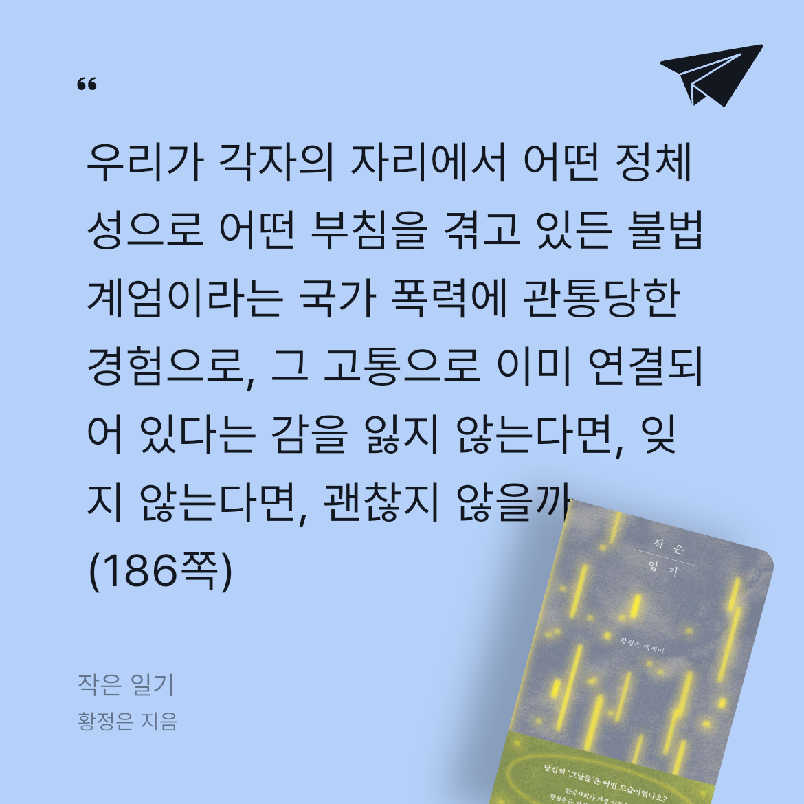 요약《작은 일기》는 황정은 작가의 두 번째 에세이집으로, 2025년 창비에서 출간되었다(ISBN: 9788936480851). 📖 2021년 첫 에세이집 《일기 日記》에 이어 4년 만에 선보인 이 책은, 2024년 12월 현직 대통령의 계엄령 선포라는 초유의 사태를 배경으로, 격동의 시대를 살아가는 작가의 일상과 사유를 담담하고 섬세한 문장으로 기록한다. 만해문학상, 김현문학상 등을 수상하며 “지금 한국에서 가장 아름다운 문장을 쓰는 작가”로 평가받는 황정은은, 이 책에서 개인의 소소한