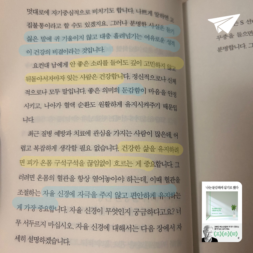 요약『나는 둔감하게 살기로 했다 (초조해하지 않고 나답게 사는 법)』는 일본의 정신과 의사이자 베스트셀러 작가 와타나베 준이치가 2018년 다산초당(다산북스)에서 출간한 자기계발서로, 예민한 현대인들에게 ‘둔감력’을 키워 초조함 없이 자신답게 살아가는 법을 제안한다. 😌 저자는 80년 이상의 삶과 의료 경험을 바탕으로, 지나치게 민감한 마음이 스트레스와 불행을 초래한다고 지적하며, 사소한 일에 연연하지 않고 유연하게 대처하는 태도가 정신적·신체적 건강을