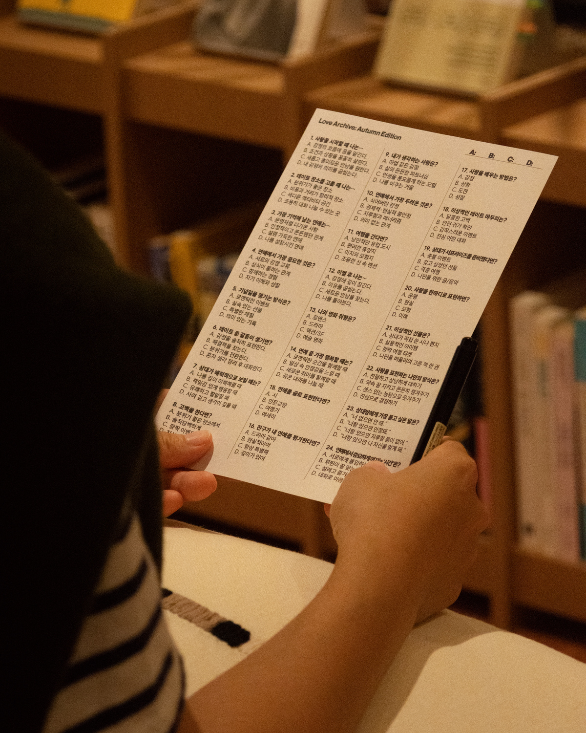 사랑에 관한 문장으로 만든 책갈피, 직접 만드는 하트 십자수, 사랑 Q&A 카드, 사랑 그림 그리기 대회 등 가볍게 참여할 수 있는 프로그램으로 구성했어요. 방문하신 분들이 자신만의 ‘사랑 기록’을 남기고 있습니다.