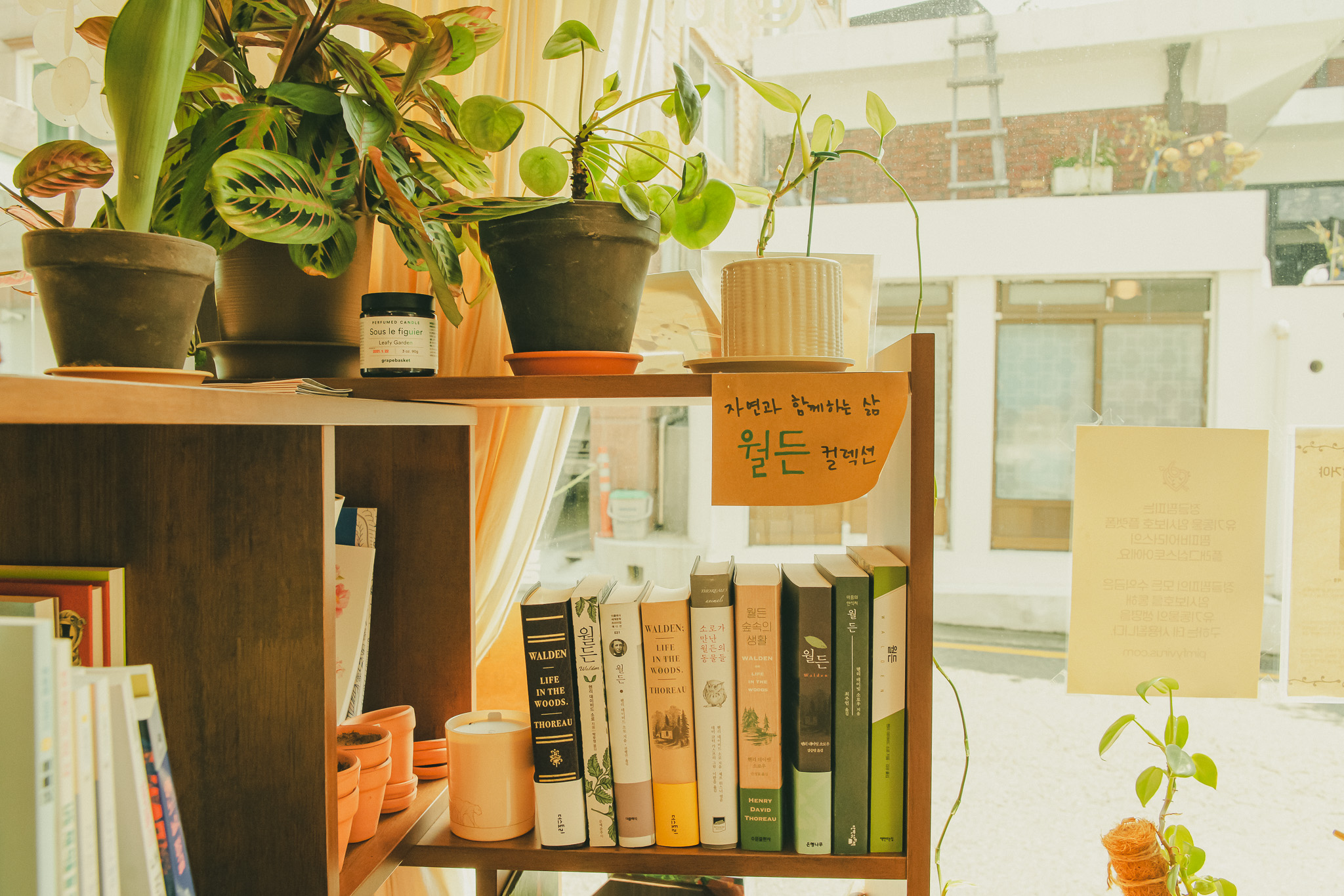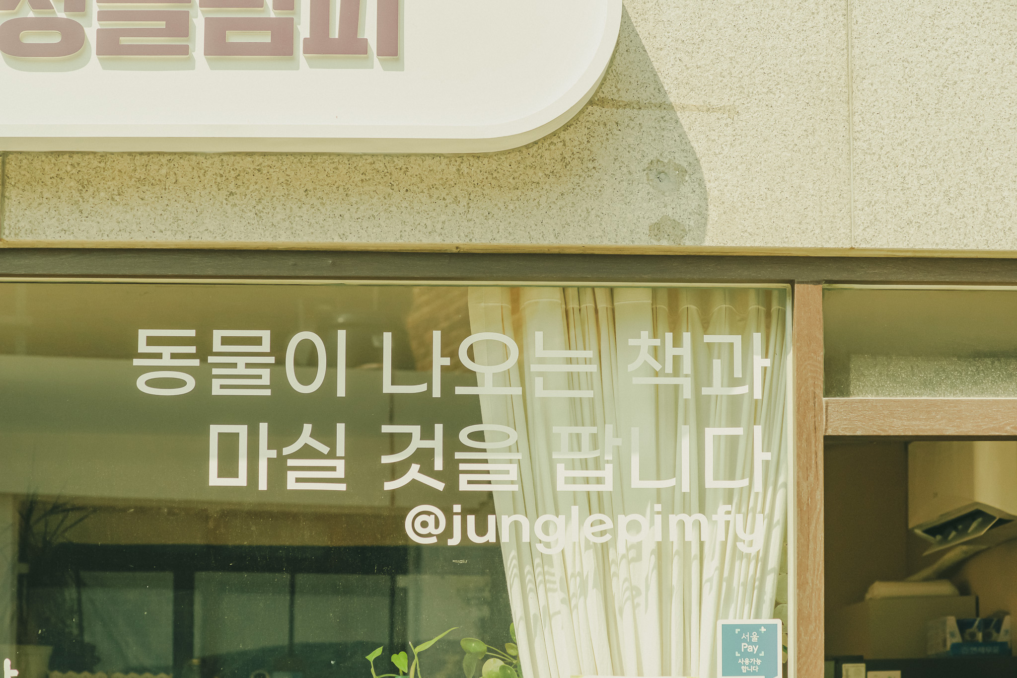‘정글’과 같은 느낌을 담기 위해 식물도 많이 들여놓고, 보기 편안한 우드톤을 전체적으로 사용했어요. 굳이 책을 사지 않으시더라도 편하게 들려주셨으면 하는 마음으로 작은 테이블들과 간단한 음료도 판매하고 있습니다. 강아지도 함께 마실 수 있는 메뉴가 있어, 산책하시는 분들도 편하게 들려주시고 있답니다.