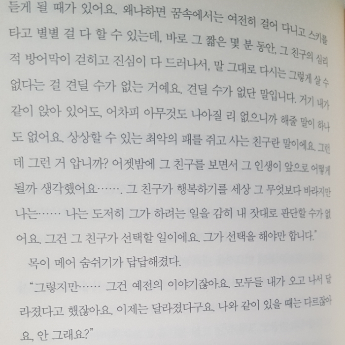 신체적으로든 정신적으로든 인생에서 큰 상실을 겪은 사람이 자신의 싦을 끝내는 큰 결정을 내렸을 때 우리가 감히 그 사람에게 앞으로는 이렇게 살면 된다. 그래도 견뎌야한다...라는 이런 조언을 해도 될까. 물론 소중한 사람이 그럼에도 계속 살아갈 수 있도록 어떠한 노력도 다 할 것이다. 그러나 스스로 생을 마감하는 것이 사고 이후로 자신이 내린 가장 주체적인 결단이자 가장 자신다울 수 있는 마지막 모습이라는 윌의 말에 그 심정을 조금이나마 이해할 수 있었다.