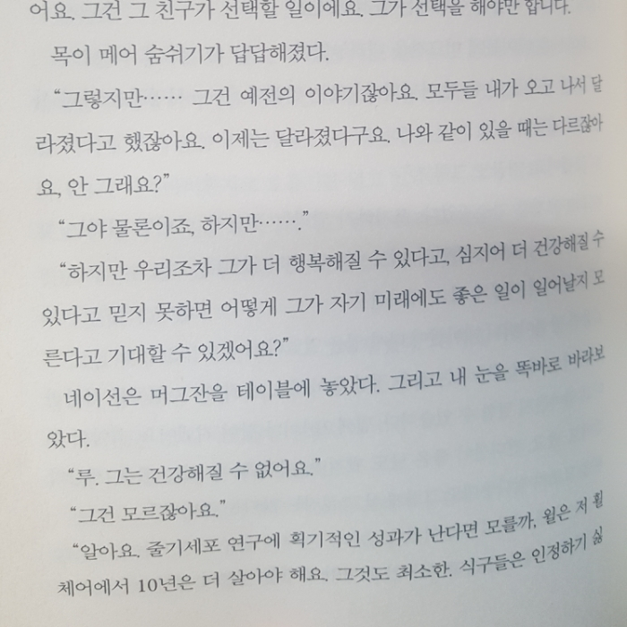 나는 이 책을 ‘새드앤딩’이라고 말하고 싶지 않다. 물론 사랑하는 사람을 떠나보낸다고 생각하면 새드앤딩이라고 말할 수 있겠지만, 그 과정에서 서로에게 유일한 위안이 되고, 인생에 대해, 삶에 대해 깊은 성찰을 얻을 수 있었다면 새드앤딩이라고 말할 수 있을까. 어쩌면 『미 비포 유』는 해피앤딩, 새드앤딩 그 너머의 이야기가 아닐까 싶다. 또 그 사이 내가 나이를 먹었기 때문인지, 잘 ‘죽기’위해 제대로 마무리를 하는 윌의 삶이 과거보다 깊이 이해가 되었다. 과거의 나는 자신이 잘 죽기 위해 타인에게 커다란 슬픔을 남겨주는 것이 진정한 사랑인가 생각했다면, 어느새 그런 슬픔의 크기조차 각자의 몫이라고 생각하게 되었달까. 만약 윌이 스스로 존엄사를 선택하지 않고, 계속 삶을 유지했다고 하더라도 그 끝이 회복이 아닌 물리적으로 숨만 쉬는 삶, 의학의 힘으로 겨우 심장만 뛰는 삶이 아니라고 말할 수 있을까. 만약 그 대상이 사랑하는 사람이라면 단 1%에도 희망을 걸겠지만, 그것이 진정한 삶인지를 묻는다면 그 대답이 결코 쉽지는 않을 것이다.
