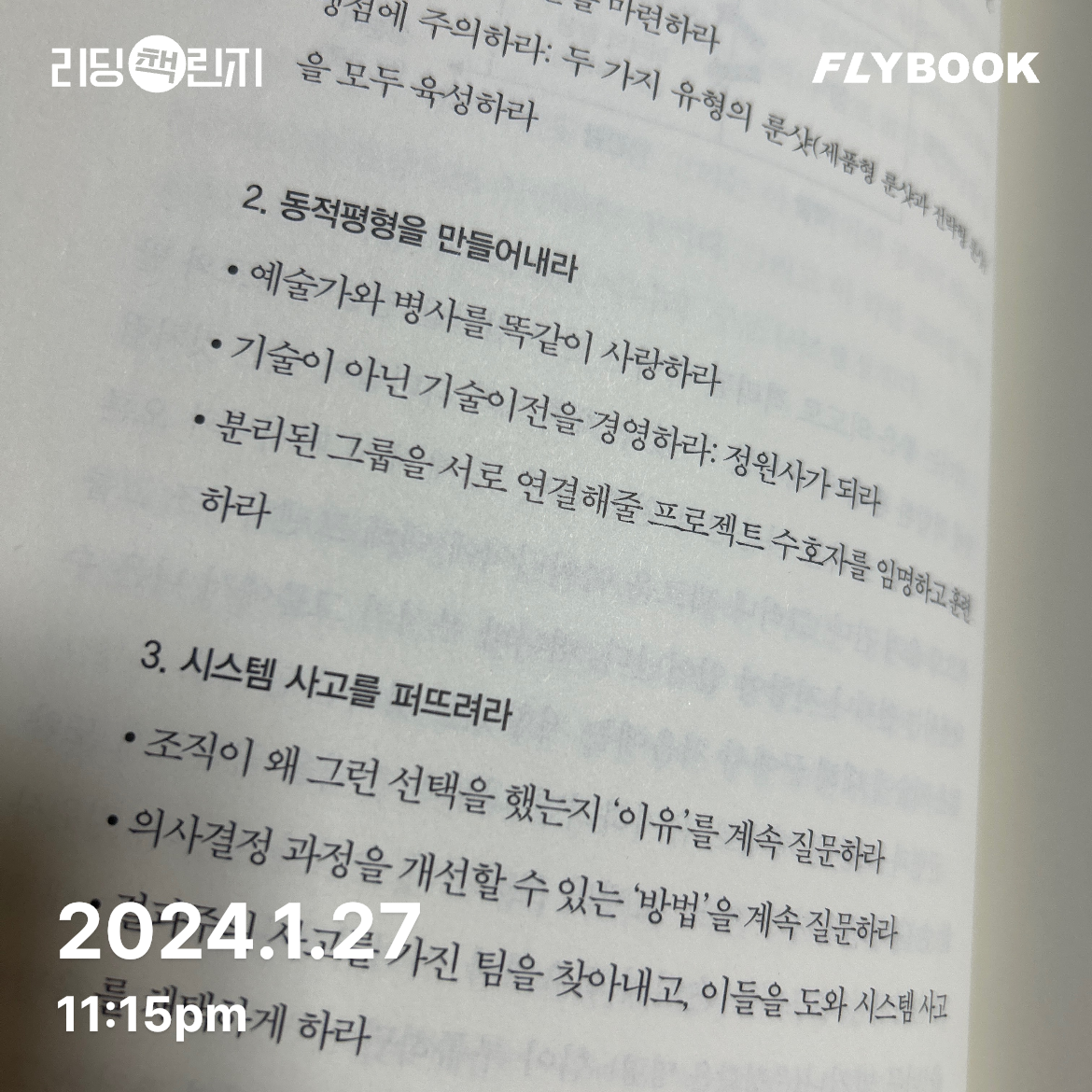 p.82 식스시그마나 전사적 품질경영처럼 효율을 중시하는 시스템은 프렌차이즈 프로젝트에는 도움이 될지 몰라도 예술가들을 숨 막히게 한다. 예컨데 포스트잇과 스카치테이프를 발명했던 3M이 2000년에 식스시그마의 열혈 전도사를 새CEO로 들이자, 혁신은 곤두박질쳤다.