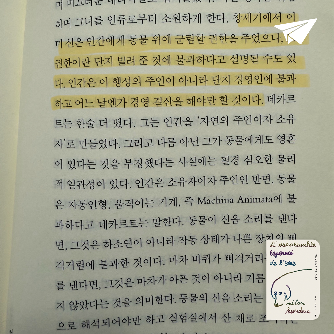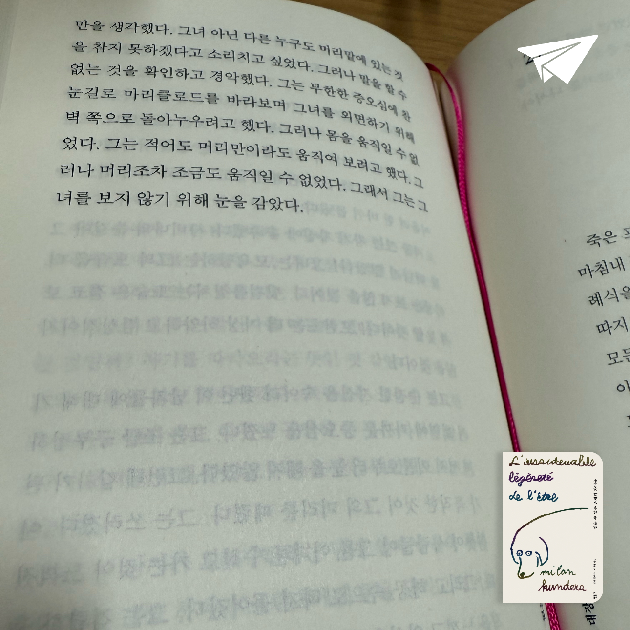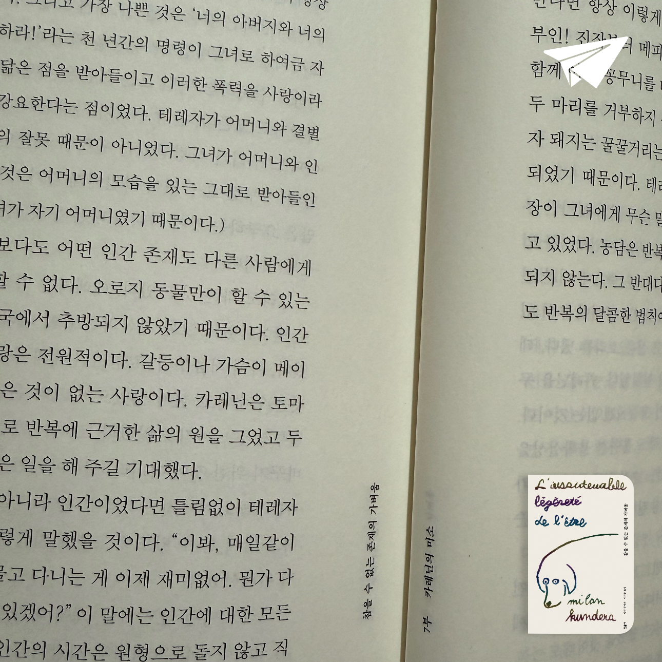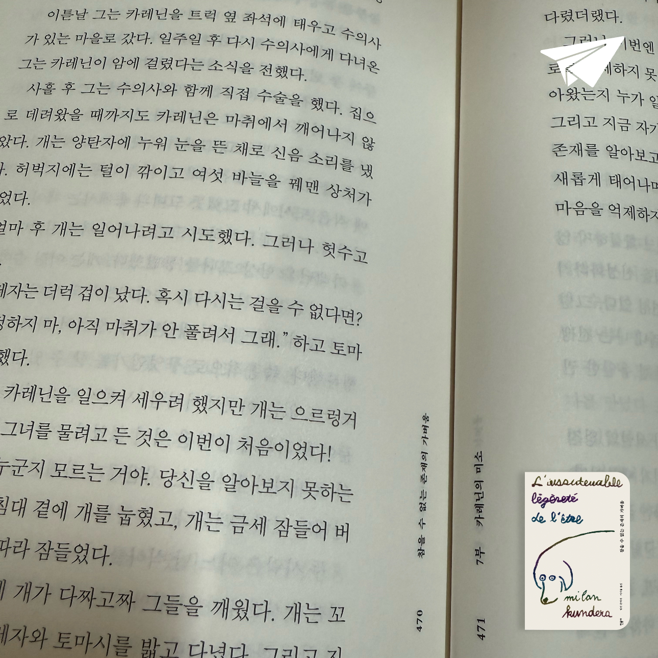 표지에 그려진 개의 그림. 카레닌… 소설 뒷부분에 카레닌을 의인화한 듯한 글(개인적으로 가장 인상깊었다)과 마지막인 듯한 카레닌을 위한 테레자와 토마시의 행동에서도 그들의 성격이 나오는 것 같았다.
