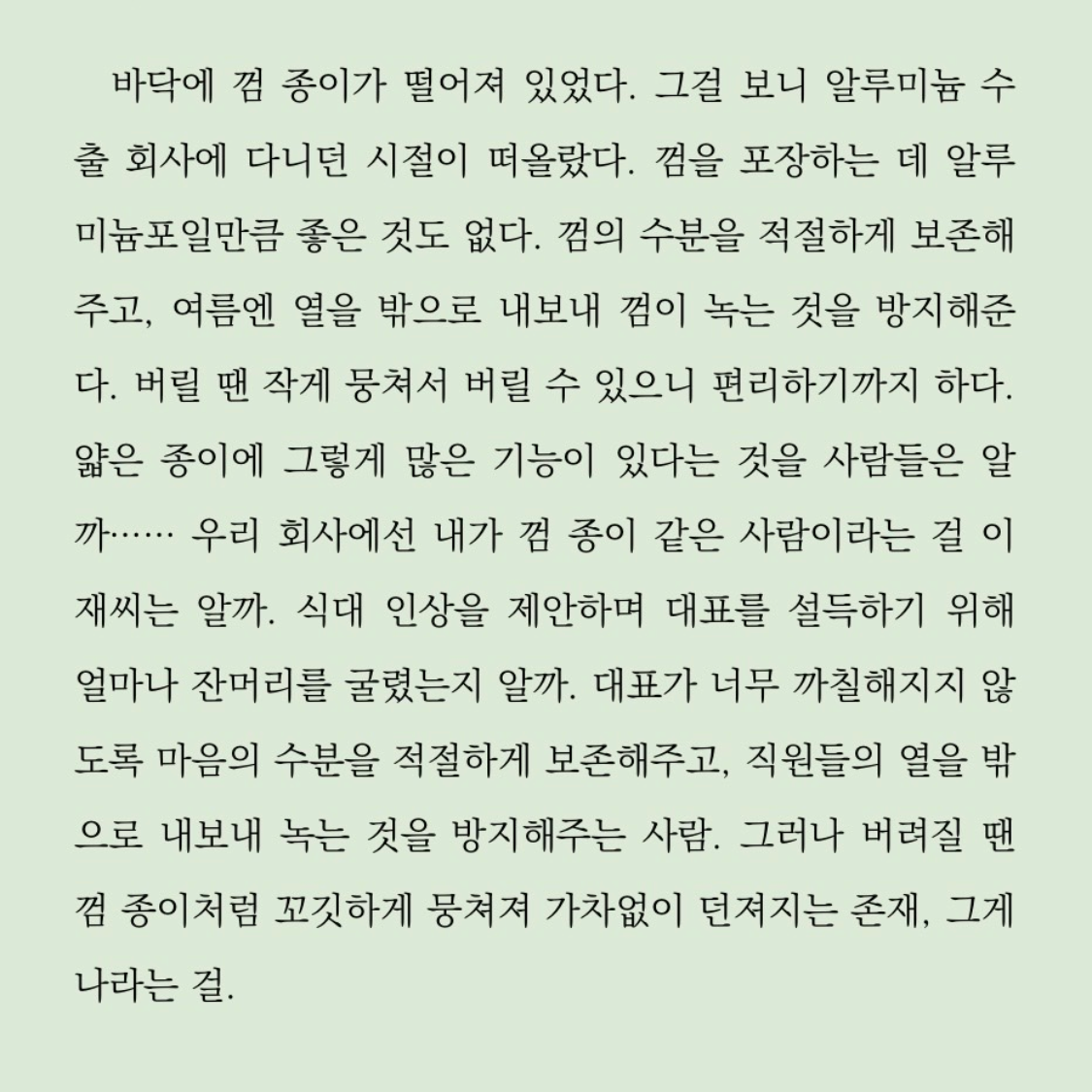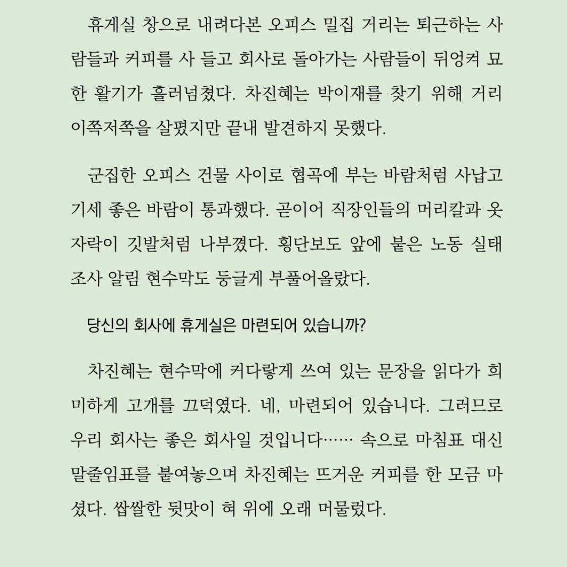 📖 대표를 설득해 직원의 복지를 향상시키려면 아첨과 잔머리는 필수였다. 차진혜는 자신이 관리직에 잘 맞는 체질이라는 걸 알았다. 그래서 가끔 슬픔이 밀려 온다는 걸 과연 누가 이해해줄까. (30%) - 이서수 <광합성 런치> 중
