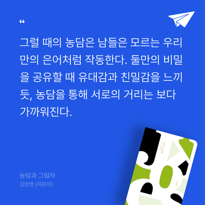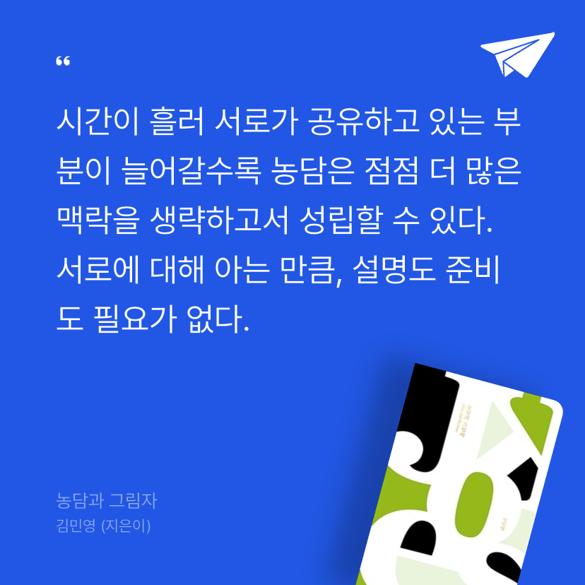 한편, 시간이 흘러 서로가 공유하고 있는 부분이 늘어갈수록 농담은 점점 더 많은 맥락을 생략하고서 성립할 수 있다. 서로에 대해 아는 만큼, 설명도 준비도 필요가 없다. 그럴 때의 농담은 남들은 모르는 우리만의 은어처럼 작동한다. 둘만의 비밀을 공유할 때 유대감과 친밀감을 느끼듯, 농담을 통해 서로의 거리는 보다 가까워진다.