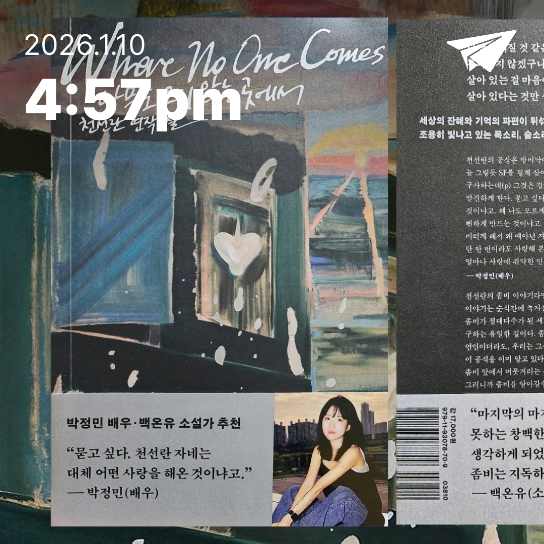 침묵의 풍경, 그 안의 온기! <아무도 오지 않는 곳에서>는 천선란 저자의 두번째 연작 소설로, 6년에 걸쳐 3부작 서사를 완성한 작품이다. 우리는 항상 좀비를 공포의 상징으로 여긴다. 하지만 천선란 작가는 좀비를 인간 존재의 가장 깊은 고독을 비추는 거울로 그려냈다. 3편의 이야기는 각각 다른 시공간에서 좀비 아포칼립스를 그린다. 1부는 감염과 붕괴의 초입에서 시작된 재앙이 이주 우주선으로 번지게 되고, 무엇을 살리게 될지, 죽일지에 대해 선택의 순간에 가로에 서이는 이들의 이야기이고, 2부는 지구를 탈출하지 못한 사람들이 서로를 돌보고, 어떤 마음으로 살아야 생존을 넘어 삶을 이어갈 수 있는지를 그린다. 3부는 인류가 사라진 지구에서 인간도 좀비도 아닌 존재들이 멸망 이후까지 사랑을 기억하고 지속하는 모습을 그려냈다. 이 작품의 수록된 3편 모두가 사랑하는 이를 끝내 놓지 못하는 마음, 그리고 너를 살리는 방식으로 내가 살겠다는 마음을 담아냈다. 사랑하는 이를 끝내 놓지 못하고, 서로를 잊지 않으려는 이들의 이야기를 그린 이 작품은 삶과 죽음, 인간과 좀비, 그리고 폐허와 낙원이 뒤섞인 세계를 잘 그려낸 작품이다. 잊힘 속에서도 끝내 사랑을 붙드는 존재! 좀비! 저자가 말하고자 하는 좀비의 비극은 절대로 먼 이야기가 아닐 것이다. 지금 우리가 살고 있는 현실에서도 마주하고 있는 것들이다. 폭력, 상실 , 병, 장애 등 이로 인해 사랑하는 이를 잊어버리는 일 말이다.