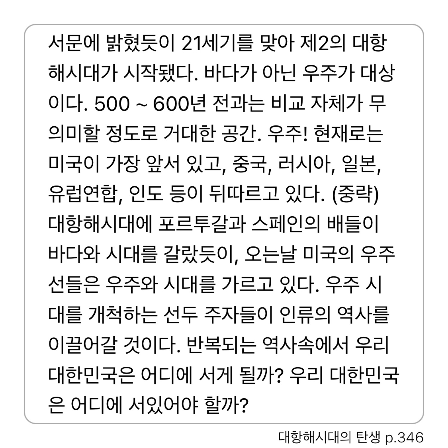 이 책은 아직 젊기에 반드시 우주 시대를 살아가게 될 청춘들과, 혁명적인 변화를 앞둔 지구촌의 현실을 직시하고, 사랑하는 후손들의 미래를 고민하는 시민들에게도 추천한다. -9p