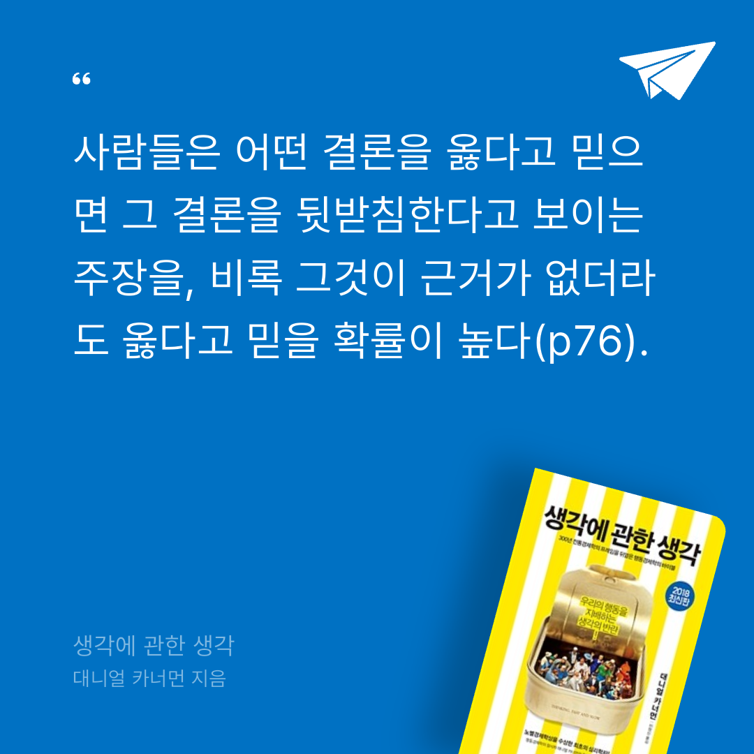 우리는 어떤 사건에 대해서 설명을 붙이는 것을 좋아해, 직관적니인 설명을 떠올린 후 그에 맞는 증거들을 찾아서 갖다붙인 후 만족스러워 한다. (확증편향)