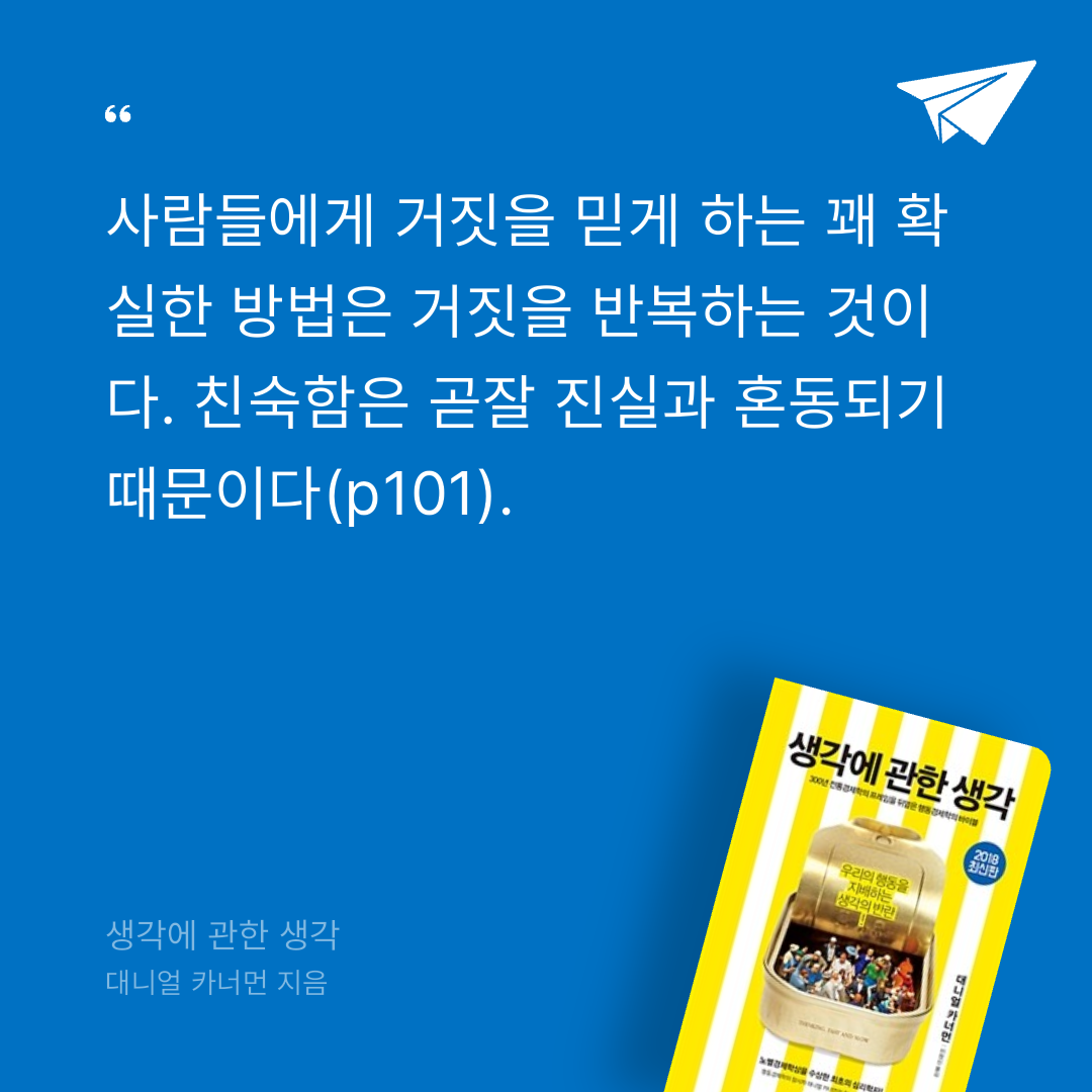 "'닭의 체온'이라는 말만 반복해서 들려줘도 '닭의 체온은 62도다'(몇 도라고 하든 상관없다)라는 말을 옳다고 생각할 확률이 높아진다. 어떤 말에서 일부만 친숙해져도 전체를 친숙하게 느끼고, 나아가 전체를 옳다고 여기기에 충분하다."
