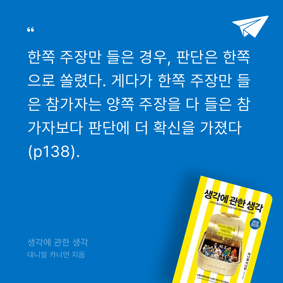 p138. 한 쪽 주장만 들은 사람들의 판단이 주로 한 쪽으로 쏠리게 됨. 게다가 한 쪽 주장만 들은 사람들은 판단에 있어서 더 확신을 가짐.