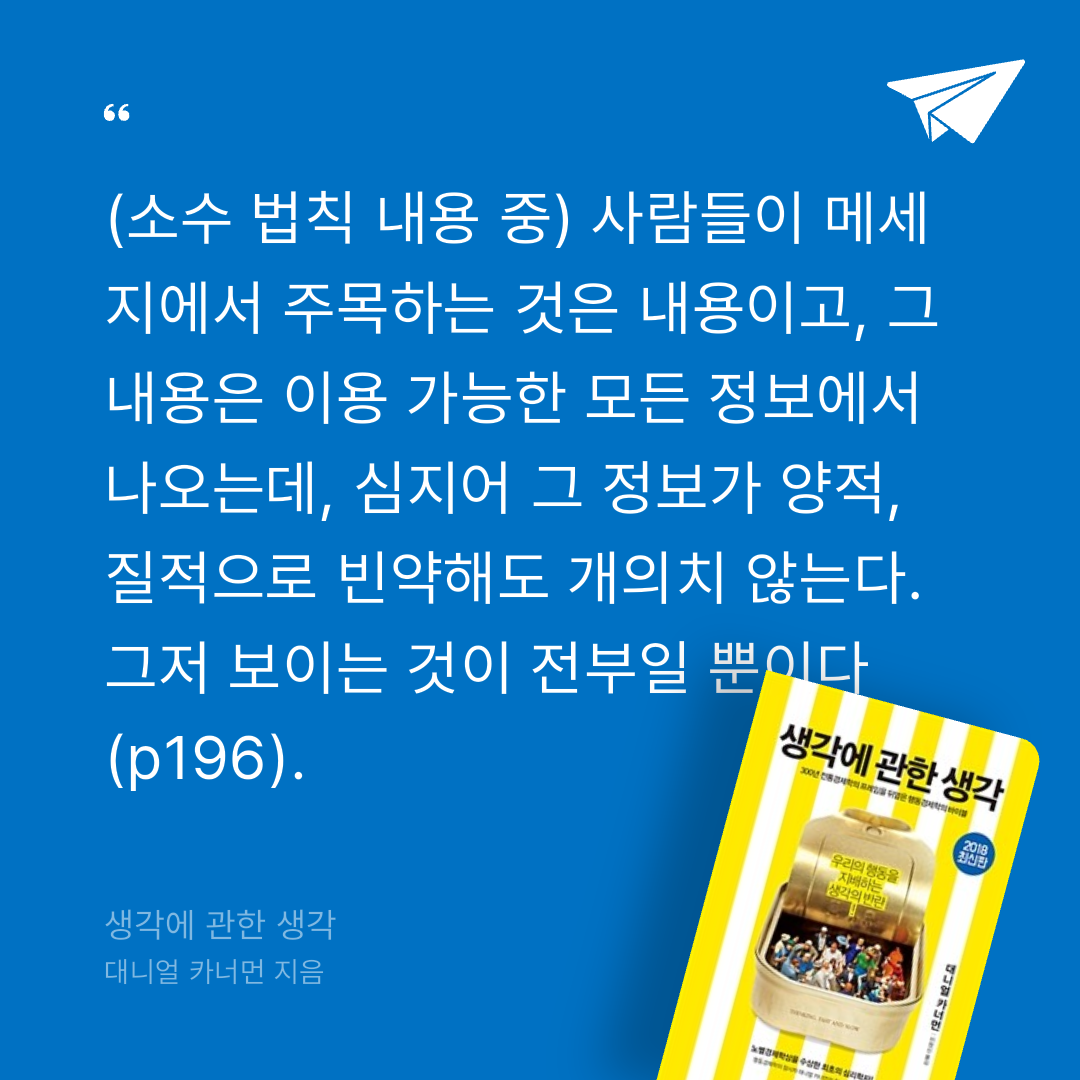 소수 법칙: 어떤 메세지가 그 자리에서 거짓으로 드러나 퇴짜 맞지 않는 한, 메세지에 노출된 순간 진실 여부나 신뢰성과는 무관하게 해당 메세지 내용은 우리 연상 체계, 생각에 이르는 과정에 영향을 미친다.