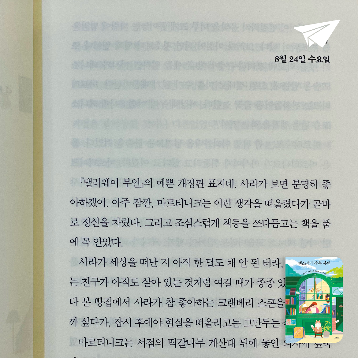 런던의 리버사이드 서점이 섬세하게 묘사되서 마치 책 속에 있는 것 같았다. 오래된 서점의 분위기, 고요한 독서 공간, 그 안에서 펼쳐지는 다양한 이야기들은 현실에서 느낄 수 없는 특별한 경험을 소개해준다. 서점의 인테리어, 서점에서 제공하는 카페의 스웨덴식 '피카', 그리고 서점 직원들의 책 추천 등 다양한 디테일을 통해 이 작품을 더욱 생생하게 만들었다.