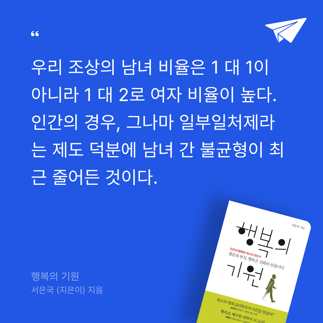 우리 조상의 남녀 비율은 1 대 1이 아니라 1 대 2로 여자 비율이 높다. 인간의 경우, 그나마 일부일처제라는 제도 덕분에 남녀 간 불균형이 최근 줄어든 것이다. 다른 포유류들의 경우, 이 비율이 3(수컷) 대 7(암컷) 정도까지도 기운다. 거의 모든 암컷은 자식을 갖지만, 소수의 수컷만이 유전자를 남겼다는 말이다.
