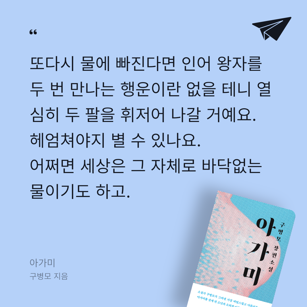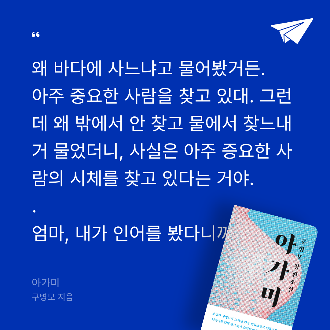 마지막 문장까지 읽고 책을 끝마쳐서야 가슴이 쉼없이 두근거렸다. 다 읽고서야 하염없이 바다를 온전히 담은 곤의 눈빛과 그의 모습이 머릿 속에 그려졌다. 내 상상 속 곤의 모습은 분명 마치 윤슬처럼 빛나는 흰 머리칼, 살짝의 젖어있는 곱슬끼의 머리와 분명 마르지만 더없이 희고 물에 빠져 빛에 반사된 조약돌의 아름다운 빛을 가진 소년의 모습을 가진 깊고 짙은 어딘가 찬란하면서 슬픈 물내음이 나는 그런 사람이었을 것이다.