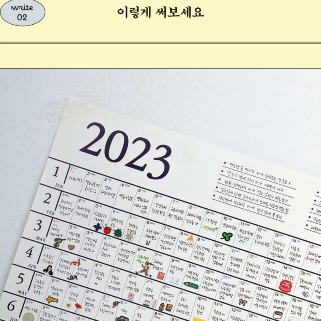 보통 눈에 잘 보이는 곳에 붙여두기 때문에 수시로 체크하기 쉽다는 장점이 있어요. 한 칸에 10자 내외의 글씨를 쓸 수 있고 365개의 빈칸이 있습니다. 1년을 한눈에 볼 수 있어서 대부분 해빗 트래커나 프로젝트 스케줄, 개인 일정을 적는 용도로 활용하는데요. 저는 조금 다르게 써보고 싶었어요. 뭘 써야 할지 한참 고민하다가 그날 있었던 일 중 기억에 남는 순간이나 상황을 짤막하게 적어보기로 했습니다.