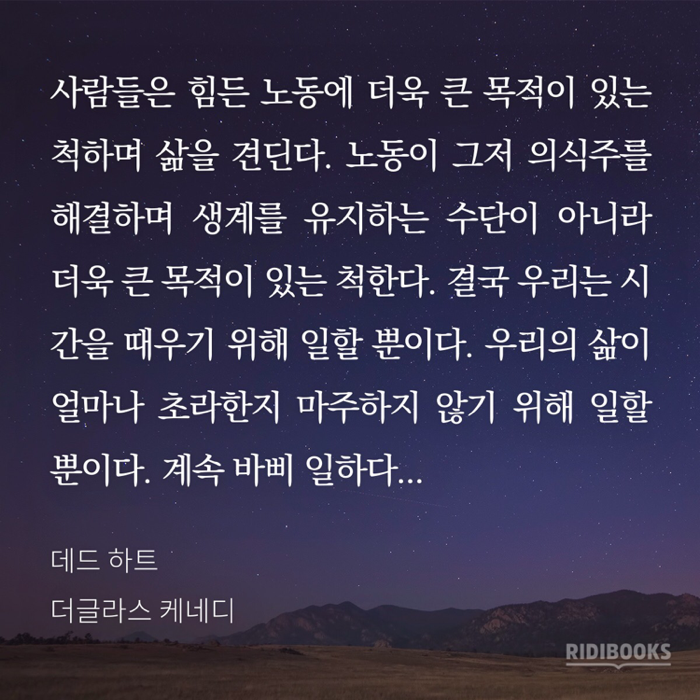 사람들은 힘든 노동에 더욱 큰 목적이 있는 척하며 삶을 견딘다. 노동이 그저 의식주를 해결하며 생계를 유지하는 수단이 아니라 더욱 큰 목적이 있는 척한다. 결국 우리는 시간을 때우기 위해 일할 뿐이다. 우리의 삶이 얼마나 초라한지 마주하지 않기 위해 일할 뿐이다. 계속 바삐 일하다 보면 우리의 삶이 절망적으로 무가치하다는 사실과 우리 스스로 빠져든 막다른 길의 깊은 수렁을 들여다보지 않아도 되기 때문이다.