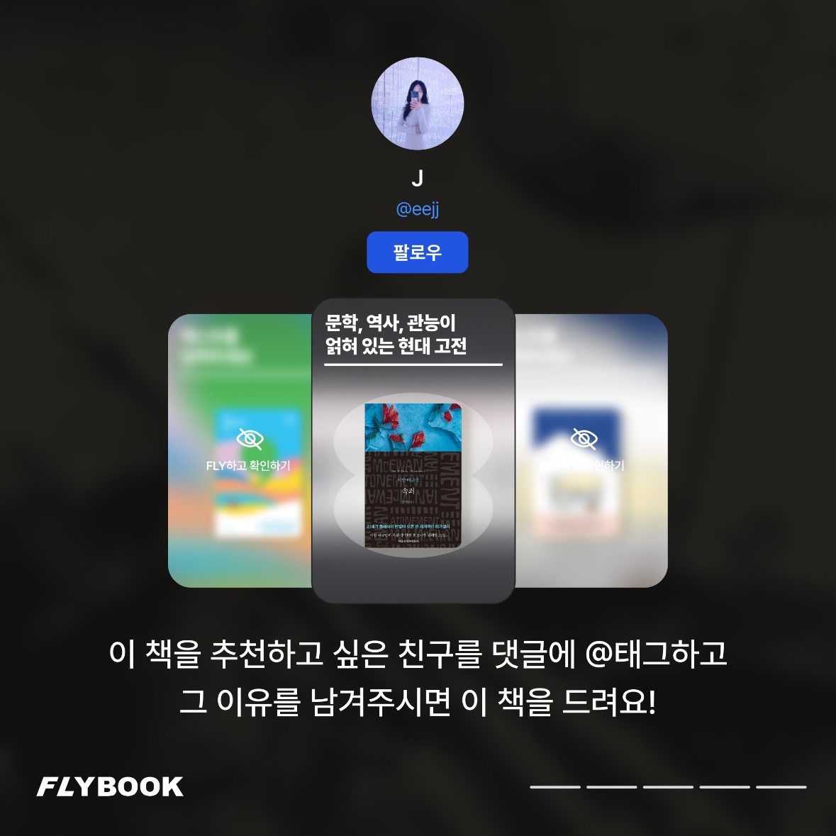 플라이북 인스타그램(@flybook_official) 게시글에서 이 책을 추천하고 싶은 친구를 댓글에 @태그하고 그 이유를 댓글로 남겨주시면 추첨을 통해 책 선물을 드립니다!