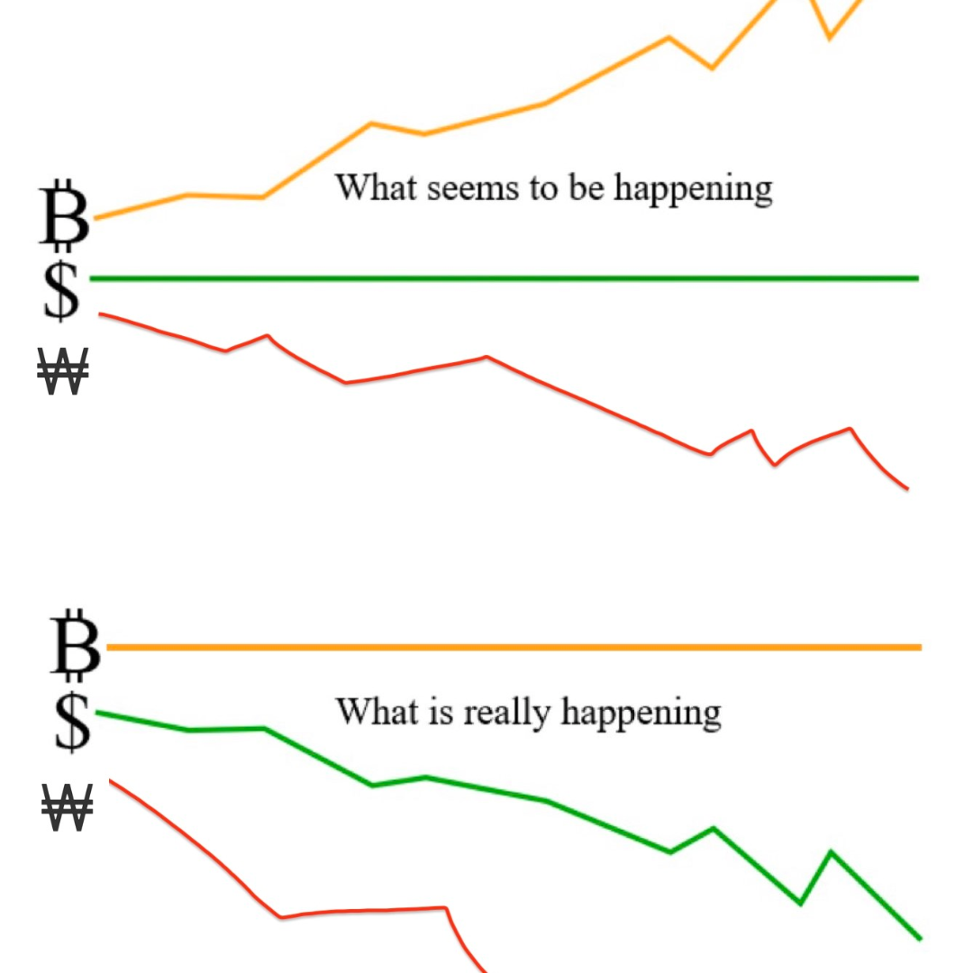 흔히 사람들이 생각할 때 달러, 원화 대비 다른 자산, 이 그래프에서는 비트코인이 올라간다고 생각하는데,
