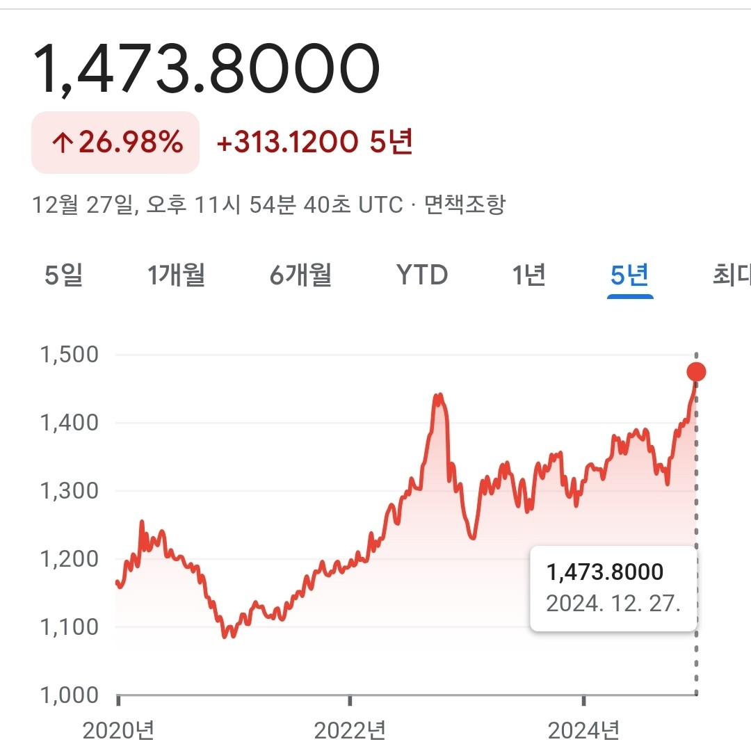 특히 달러는 5년 기준으로 원화 대비 26% 올랐으므로 원화의 가치 하락은 더 심해진다.