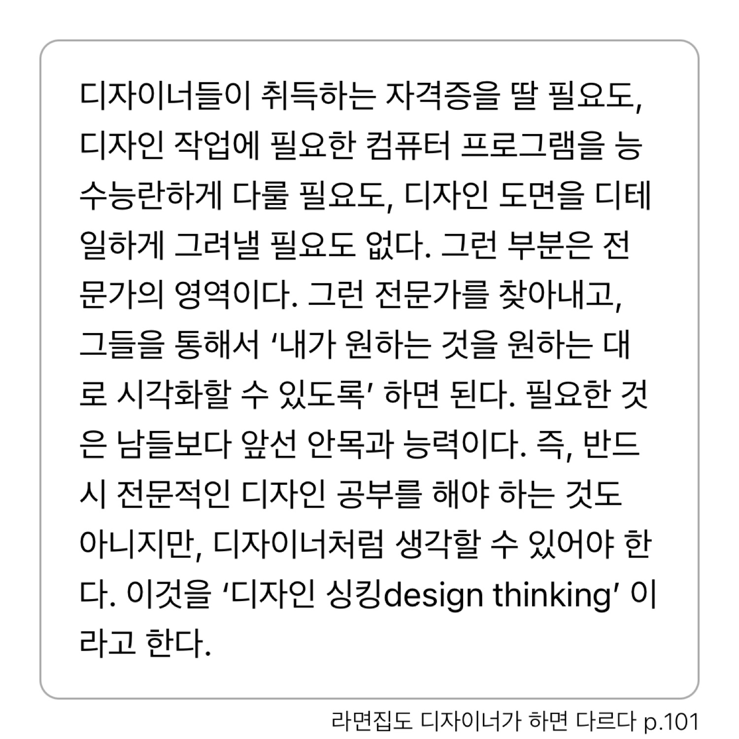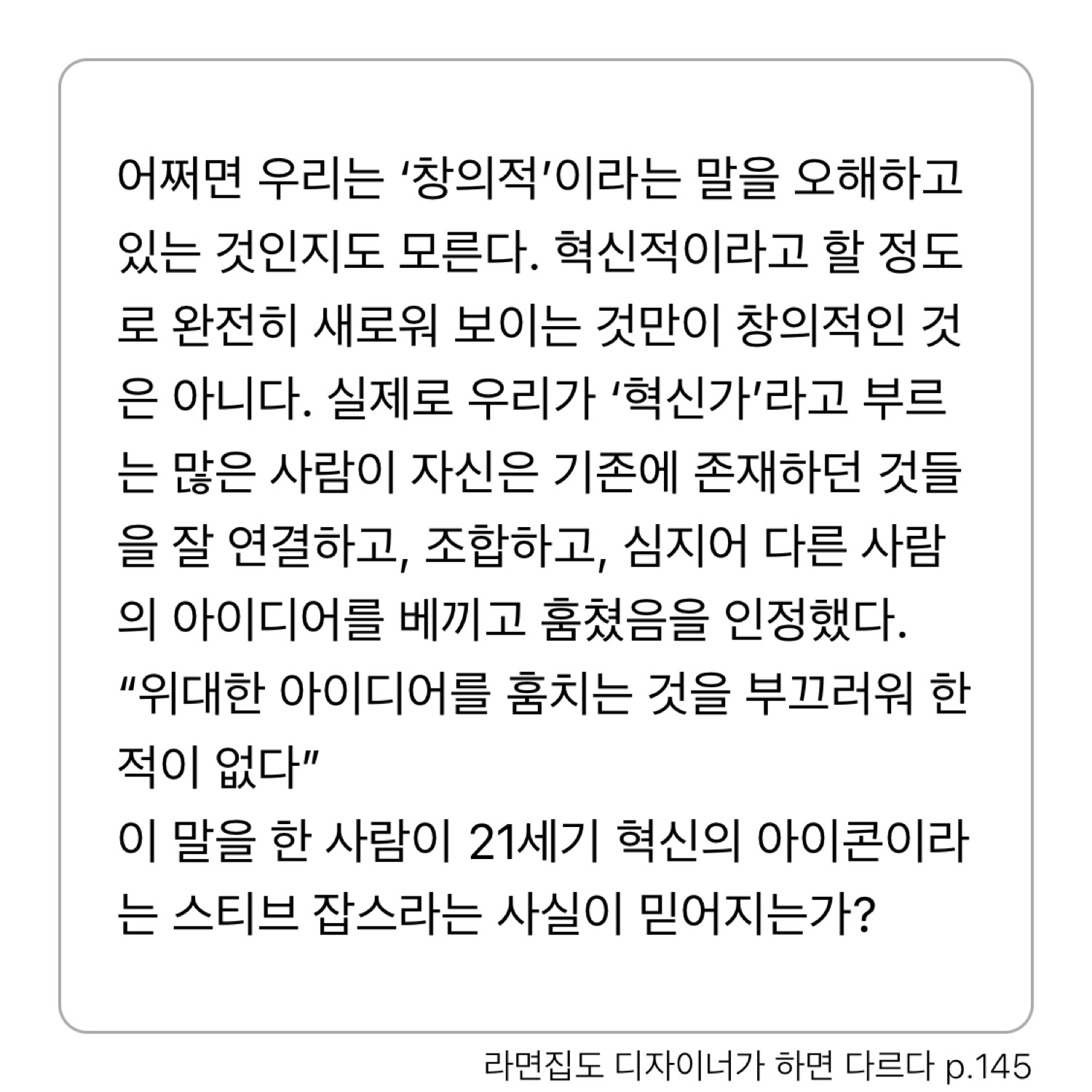 “애플의 제품이 실로 대단한 이유 중 하나는 그것을 만드는 사람이 엔지니어와 컴퓨터공학자만이 아니라는 겁니다. 예술가와 음악가도 있지요. 바로 그런 공학과 인문학의 교차가 마법과도 같은 제품을 만들어내는 근원입니다.”