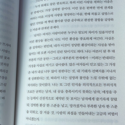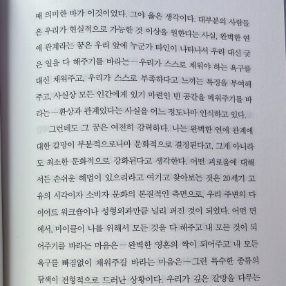 … 즉 언젠가 완벽한 사람이 나타나서 나를 사로잡아 모든 것이 분명하고 밝고 모호함 따위는 없는 미래로 데려갈 것이라는 생각을 버리기가 끔찍이 어렵다. 하지만 나도 인간일 뿐인 것을 어쩌겠는가.
